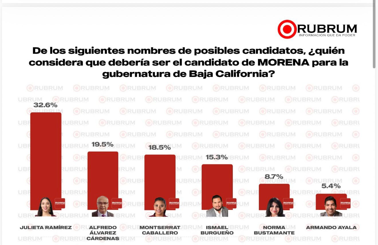 Por otro lado, la empresa Rubrum indicó en su más reciente estudio, que la legisladora bajacaliforniana, Julieta Ramírez, encabeza las preferencias con un 32.8 por ciento, por un 19.5 por ciento de su más cercano contrincante.