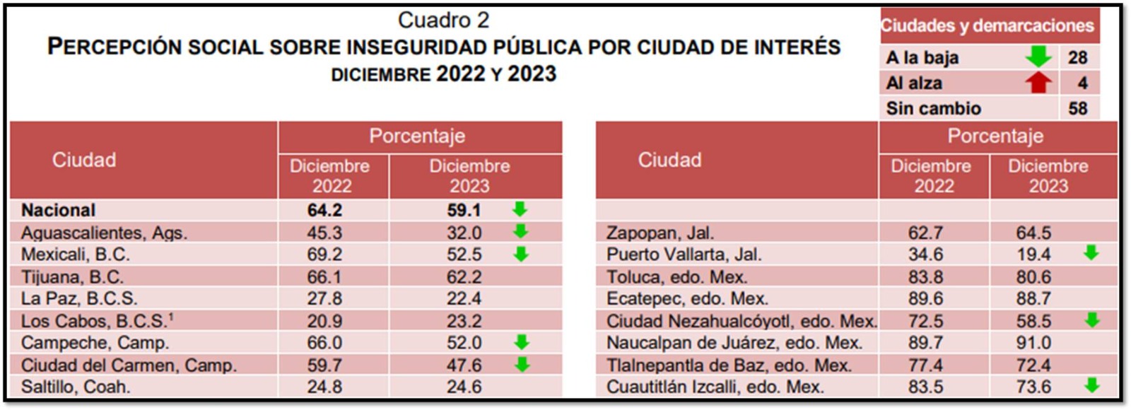 Detalló que, en diciembre del 2022 69.2% de la población de 18 años y más, considero que es inseguro vivir en la ciudad, sin embargo, esta percepción tuvo una disminución en el estudio de diciembre 2023 registrado un 52.5%.