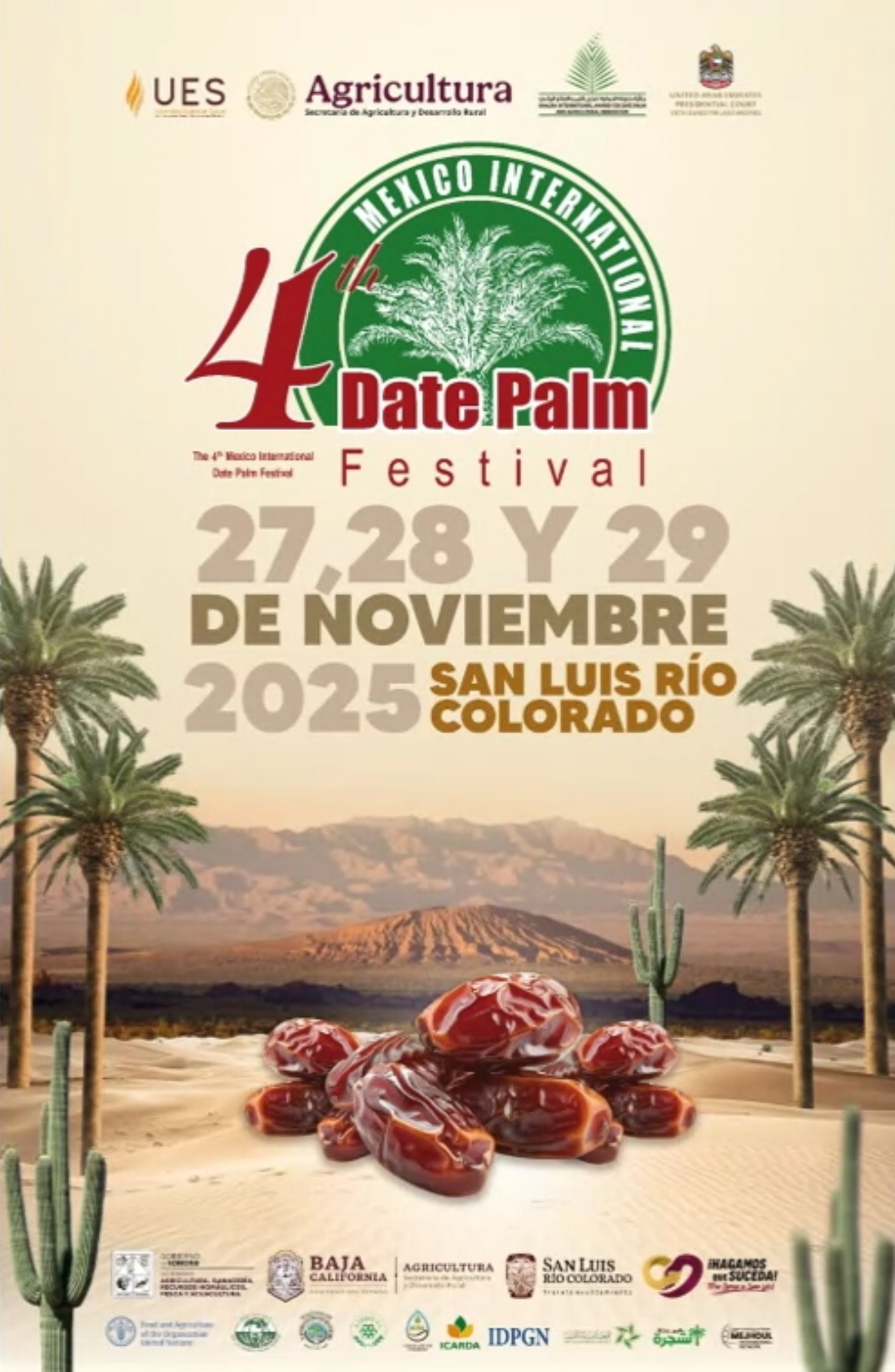 La Secretaría de Agricultura y Desarrollo Rural (AGRICULTURA), el Gobierno del Estado de Sonora, la Universidad Estatal de Sonora (UES) y el Premio Internacional Khalifa anunciaron la cuarta edición del Festival Internacional de la Palma Datilera en México, una plataforma de cooperación científica, técnica y comercial entre México y Emiratos Árabes Unidos, que se realizará del 27 al 29 de noviembre de 2025.