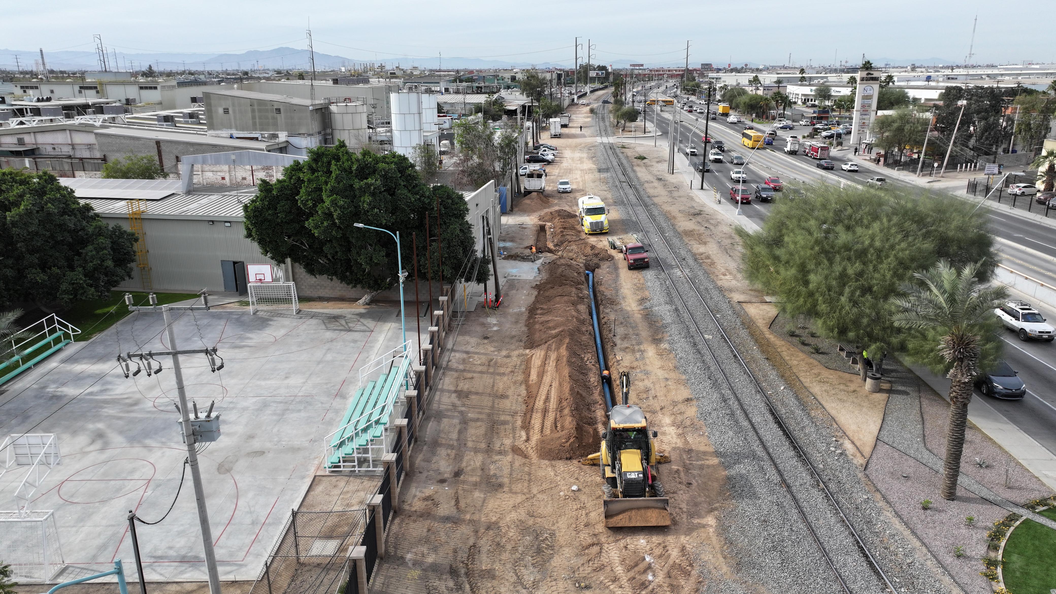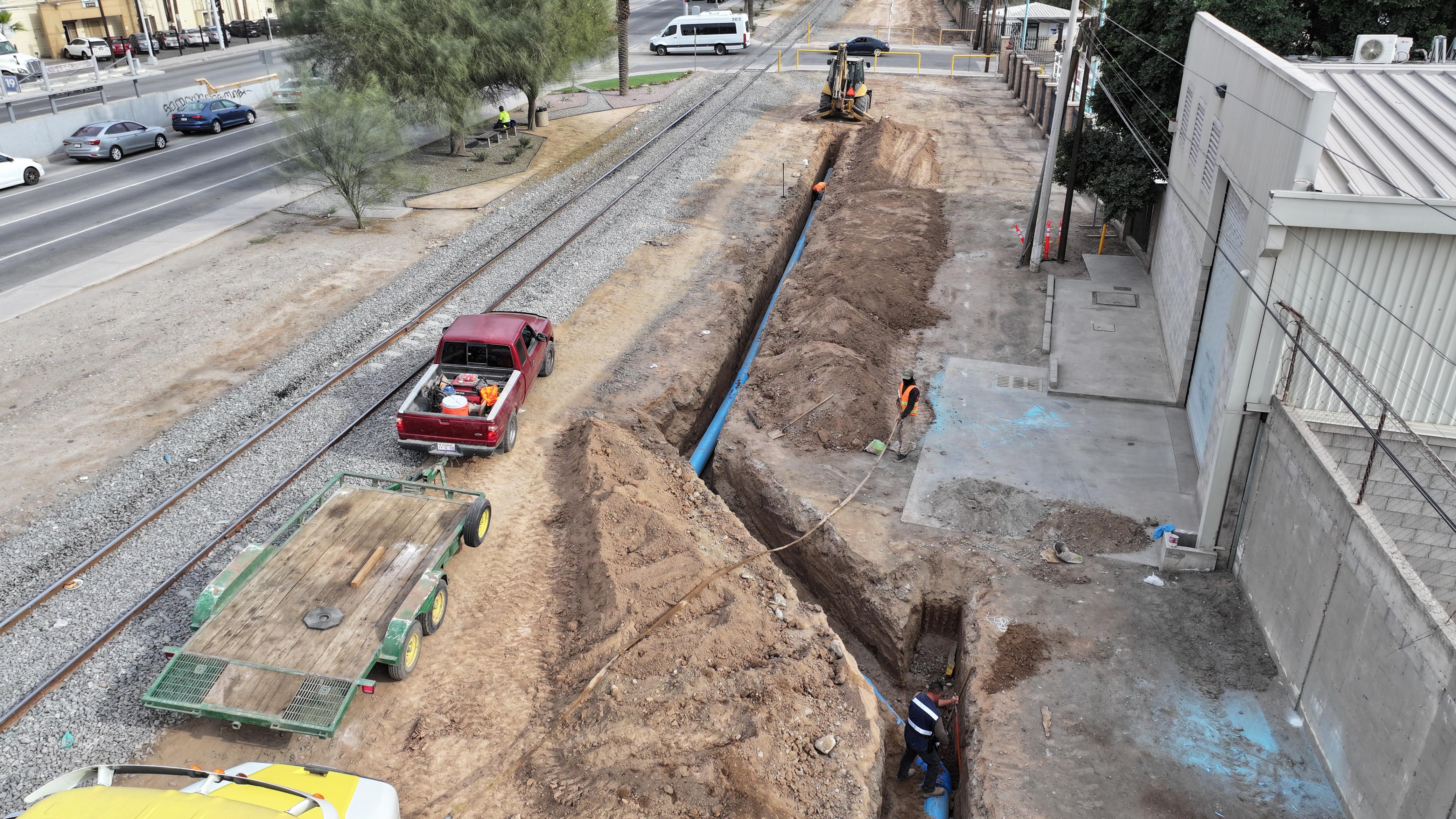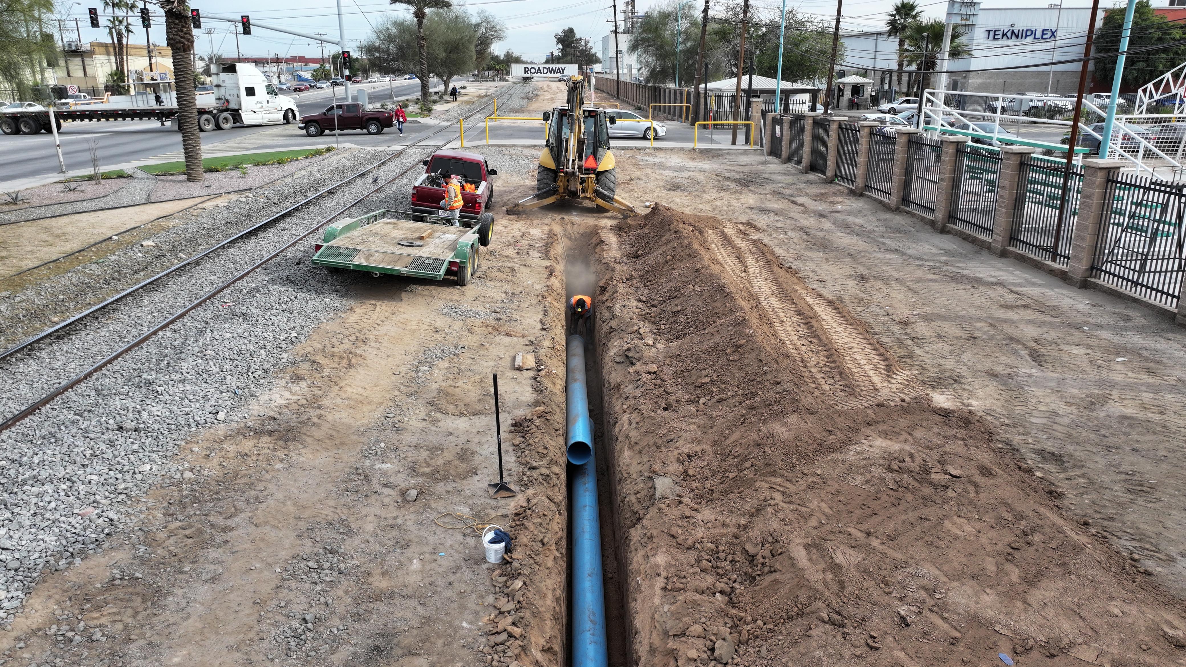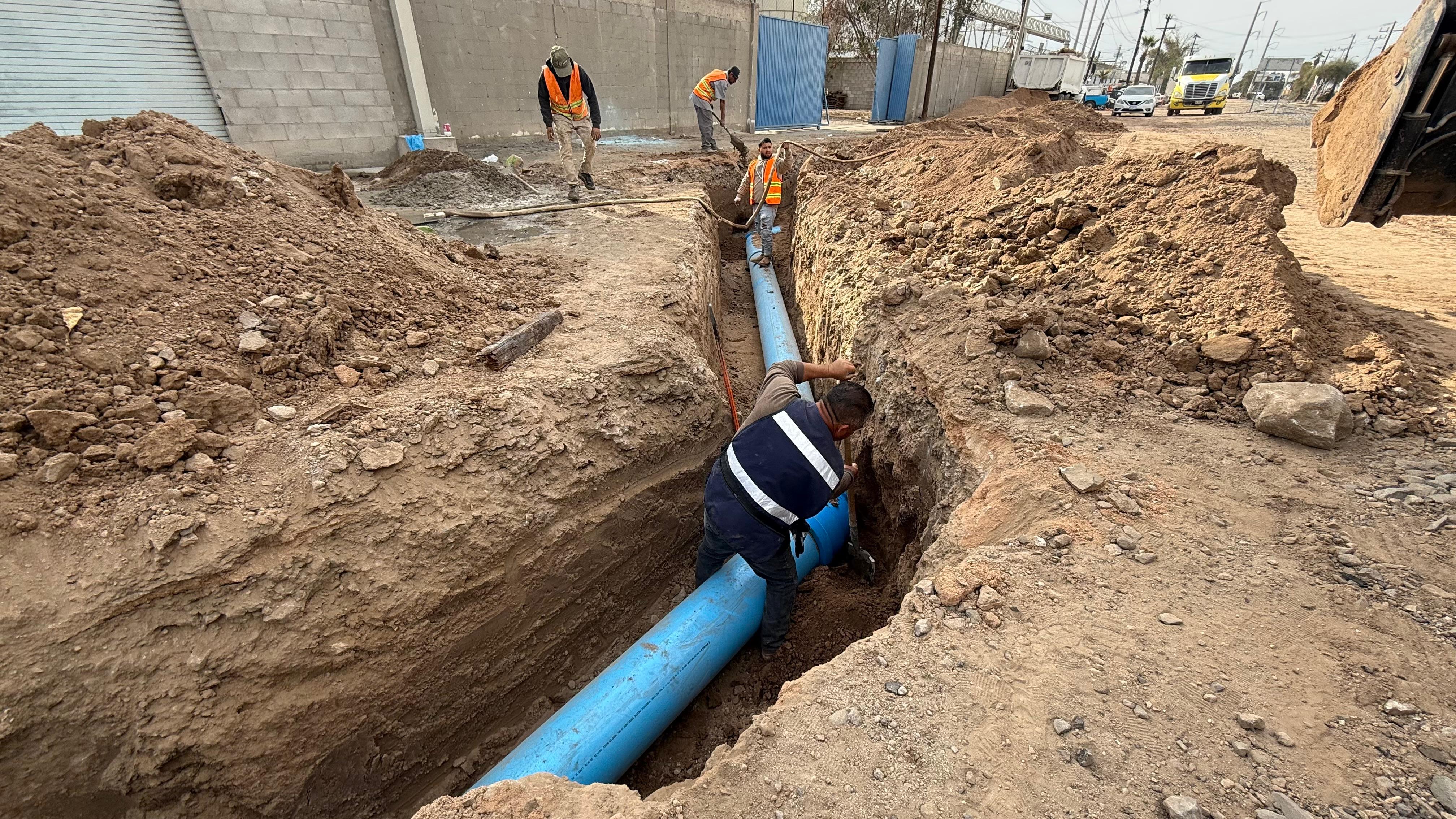 Mexicali. — La Comisión Estatal de Servicios Públicos de Mexicali (CESPM) lleva a cabo la reposición de la línea de agua potable de asbesto-cemento por tubería de PVC hidráulica de 12 pulgadas de diámetro, sobre la carretera a San Luis Río Colorado, en el tramo comprendido desde la avenida Topacio hasta la calle San Francisco.