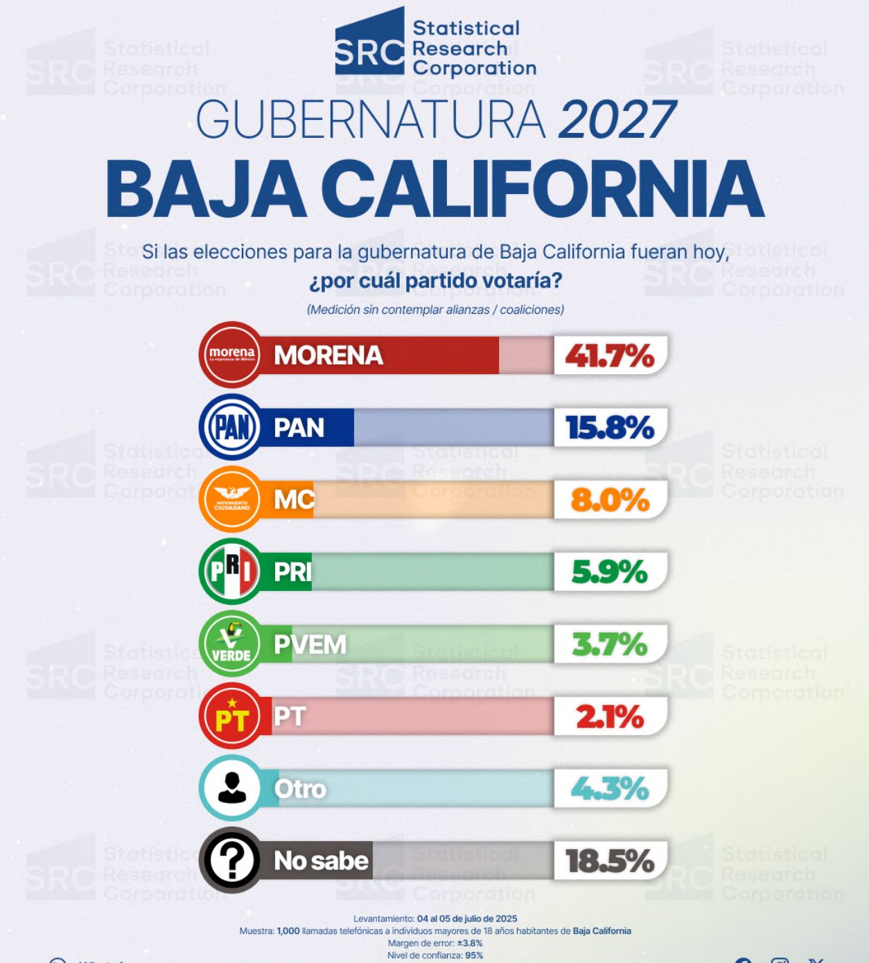 - Diversas encuestas publicadas en agosto confirman que Morena conserva la preferencia ciudadana en Baja California, colocándose por encima de todas las fuerzas políticas.