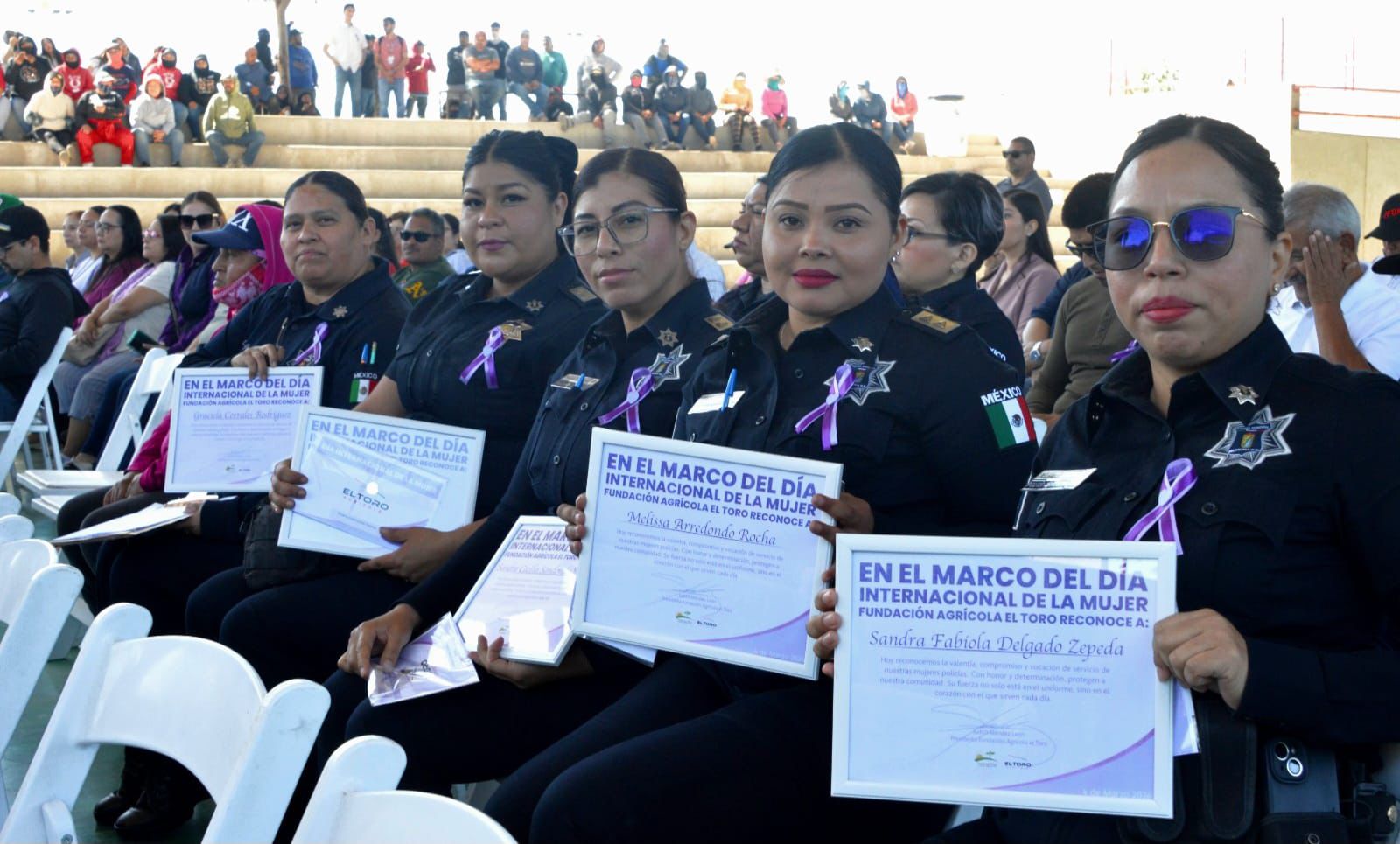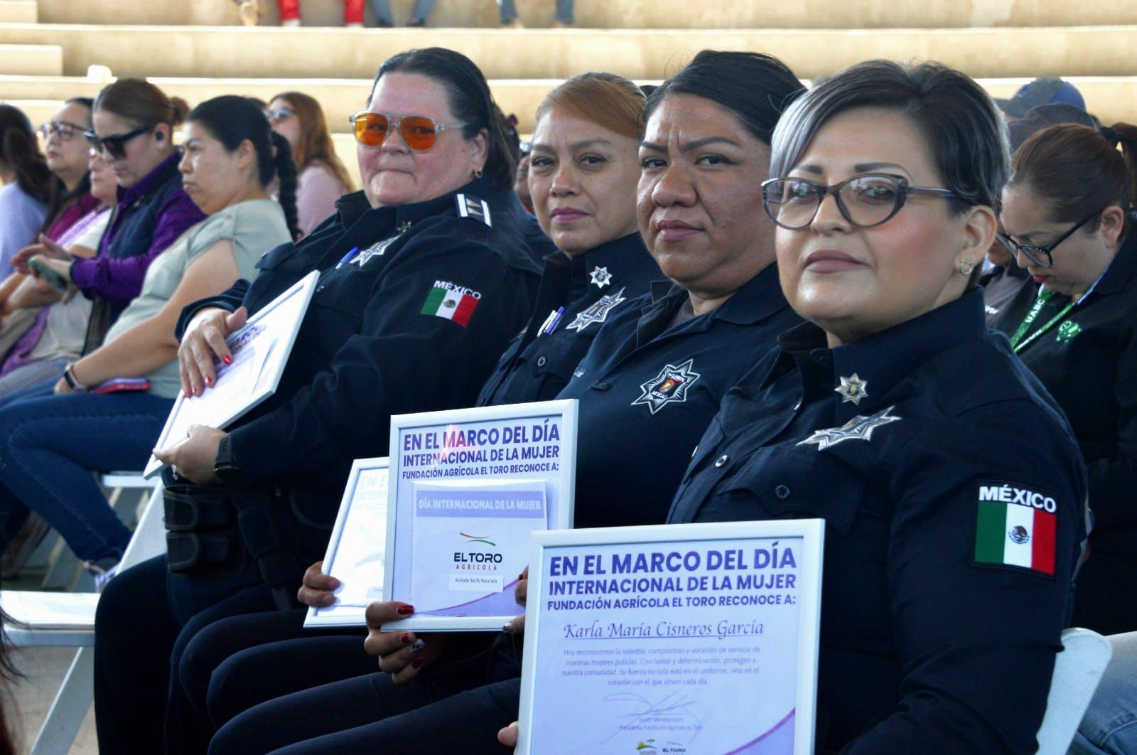 Mexicali, Baja California, a 04 de marzo de 2026. En el marco de la conmemoración del Día Internacional de la Mujer, diez mujeres policías municipales adscritas a la zona del Valle de Mexicali recibieron una beca y diploma por parte de la empresa mexicana Agrícola El Toro, a manera de reconocimiento y agradecimiento por la labor desarrollada en dicha área de la ciudad.