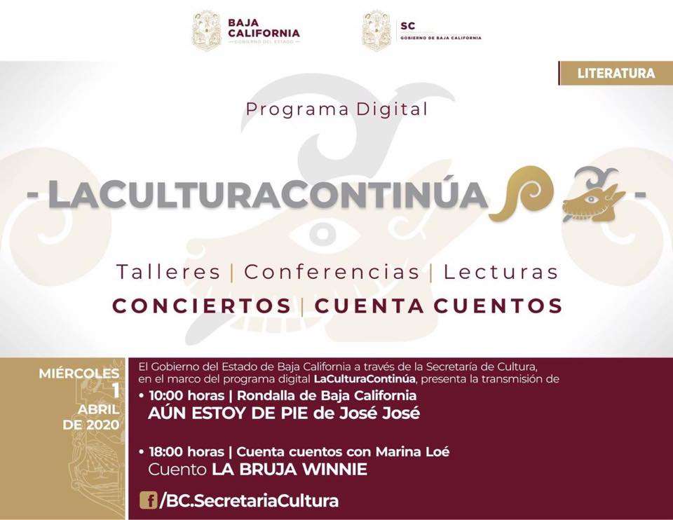 En el mes de abril, la Secretaría de Cultura mantendrá su programación digital “LaCulturaContinúa”, implementada desde el pasado 19 de marzo, a través de redes sociales en acuerdo con el gobernador de Baja California, Jaime Bonilla Valdez, con el objetivo de brindar una opción de esparcimiento desde casa para la población.