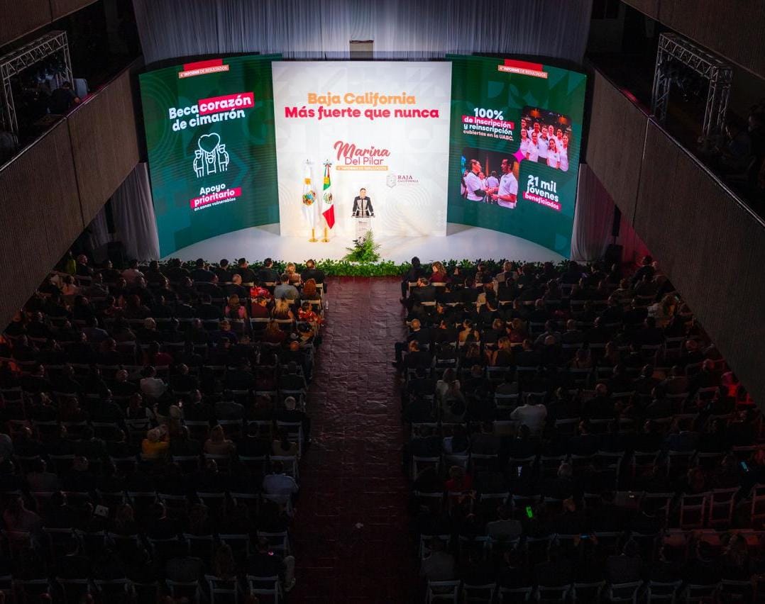 MEXICALI.- La gobernadora de Baja California, Marina del Pilar Avila Olmeda, presentó su Cuarto Informe de Gobierno, en el que anunció la creación de la Beca Corazón de Cimarrón, un programa que garantiza que ningún joven de la Universidad Autónoma de Baja California (UABC) vea truncado su sueño de estudiar por falta de recursos.