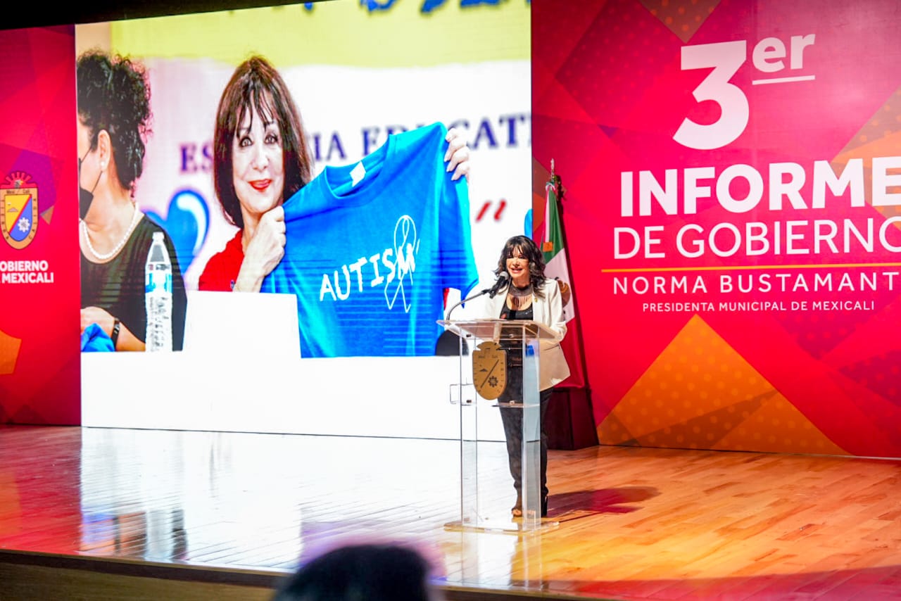 En su discurso, la alcaldesa de Mexicali presentó las acciones más relevantes de los cinco ejes de su gobierno; Mexicali Seguro y en Paz, Mexicali Crece, Bienestar para Todas las Personas, Gobernar para Servir e Igualdad de Género.