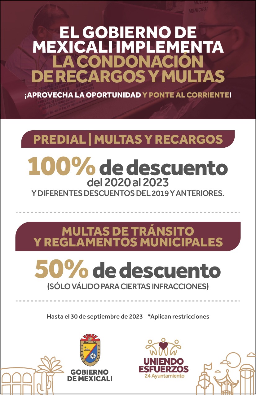 Mexicali, B.C. A miércoles 05 de julio 2023.- Apoyando a cuidar el patrimonio de las familias mexicalenses, el Gobierno de Municipal mantiene la condonación de multas y recargos en el pago del impuesto predial, así como, de otras contribuciones.