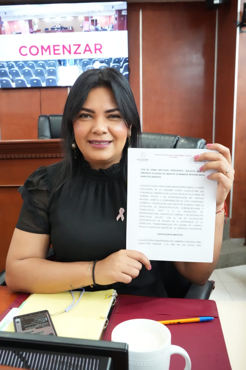 Mexicali, B.C., lunes 20 de octubre de 2025.- Con el fin de que se instalen los contenedores necesarios para la basura en el entronque de la carretera Transpeninsular, en Laguna de Chapala hacia la carretera San Felipe, la Diputada Dunnia Montserrat Murillo López presentó un Punto de Acuerdo ante el Pleno.