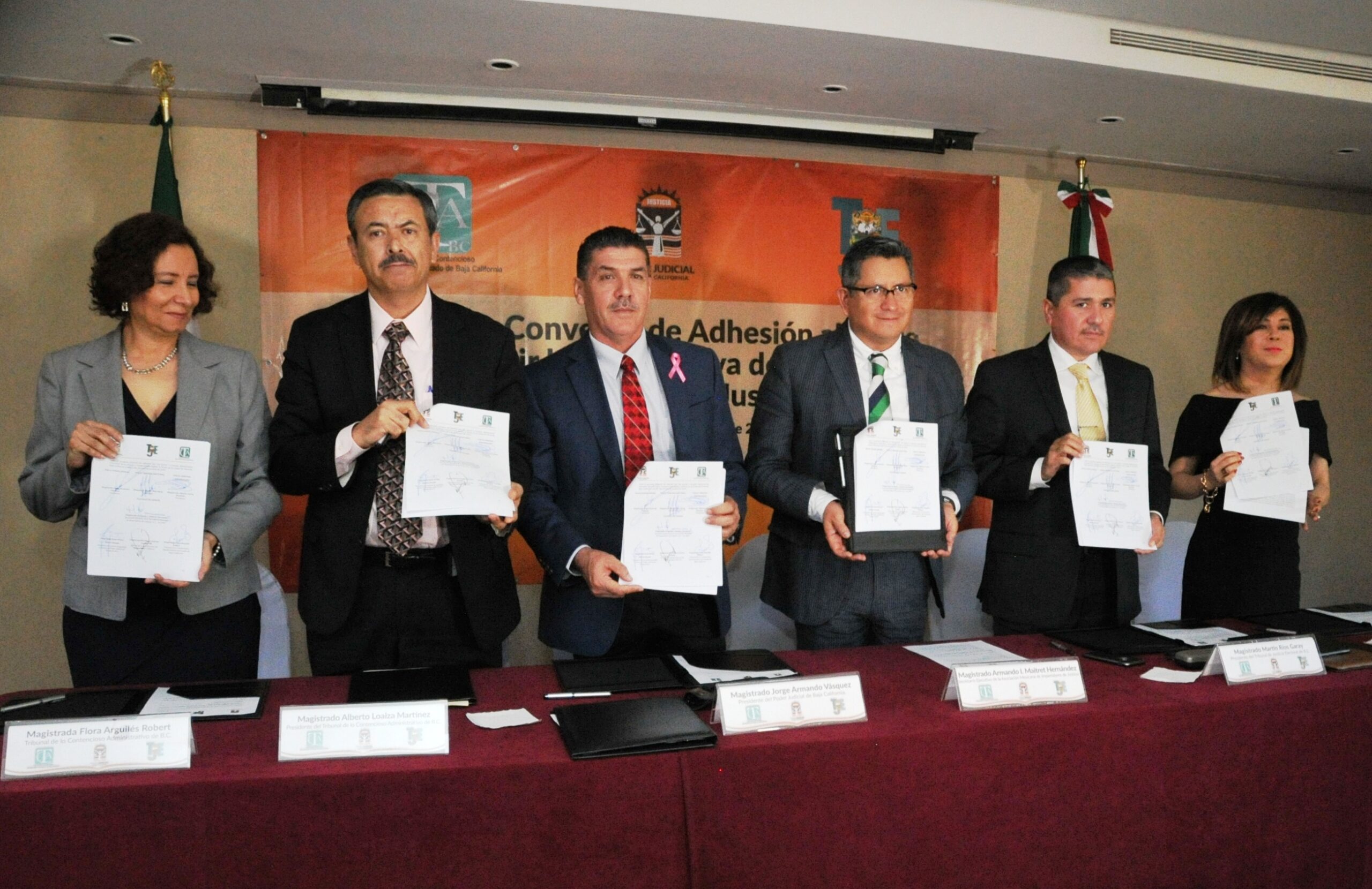 Este Convenio fue signado en conjunto con el Tribunal Electoral de Baja California y el Tribunal de lo Contencioso Administrativo de esta entidad, quienes con la representación de sus titulares, Magistrado Martín Ríos Garay y Magistrado Alberto Loaiza Martínez, respectivamente se comprometieron ejercer las acciones que implica el adherirse a este pacto.