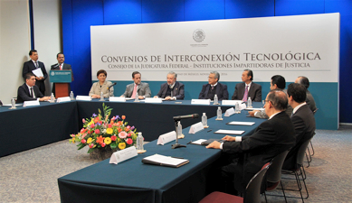 Asimismo, el Ministro Presidente del Poder Judicial de la Federación y del Consejo de la Judicatura Federal, Luis María Aguilar Morales, señaló en el evento “que este modelo constituye un sistema de gestión jurisdiccional interna y externa, único en su tipo a nivel mundial, que incluye la firma electrónica, listas digitales de acuerdos, además de audiencias y sesiones en vivo por órgano jurisdiccional” y con ello se acuerda la asesoría y colaboración conjunta, para la implementación y uso de este modelo de interconexión a fin de aprovechar al máximo los recursos electrónicos que ofrece la tecnología en beneficio de los justiciables.