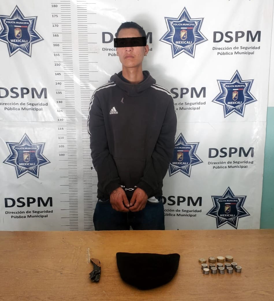 Mexicali, Baja California, a 30 de enero de 2025. Derivado de un recorrido de vigilancia preventivo, agentes de la Dirección de Seguridad Pública Municipal de Mexicali (DSPM) detuvieron este jueves a un presunto objetivo prioritario relacionado a varios robos con violencia en distintas sucursales de tienda Oxxo. Su arresto se dio luego de reportarse un asalto a dicha cadena comercial en el fraccionamiento Villa del Roble.