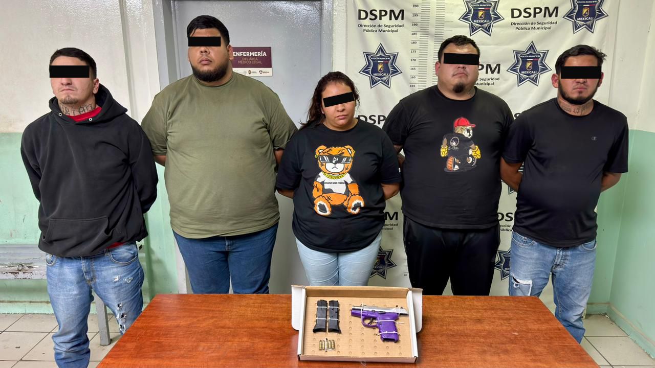 Mexicali, Baja California, a 04 de abril de 2026. Derivado de un llamado a la línea única para emergencias 9-1-1, en el que se reportaron amenazas con arma de fuego en el fraccionamiento Condesa, agentes de la Dirección de Seguridad Pública Municipal (DSPM) detuvieron la madrugada de este sábado a cinco personas en poder de una pistola calibre 09 milímetros y dos cargadores con cinco cartuchos útiles.