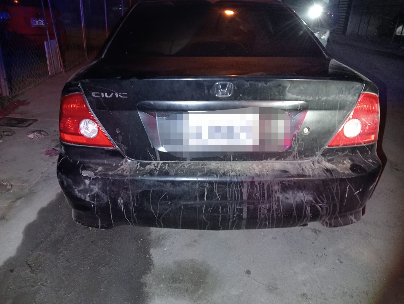 Cabe mencionar que al interior del vehículo Honda Civic de color negro con placas de California se apreciaban manchas de sangre, quedando a las afueras del domicilio donde ocurrió el hecho. El hoy asegurado fue puesto a disposición de las autoridades correspondientes.