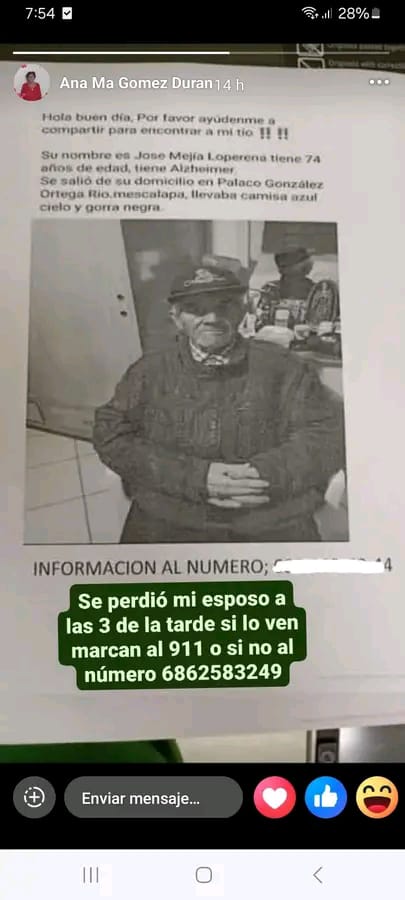Debido a que a través de redes sociales había una alerta de búsqueda para encontrar al señor José Mejía Loperena, quien había sido visto por última vez al salir de su domicilio en la colonia González Ortega. Una vez empleadas las gestiones de investigación, familiares del adulto mayo fueron encontrados para darles aviso sobre el hallazgo.