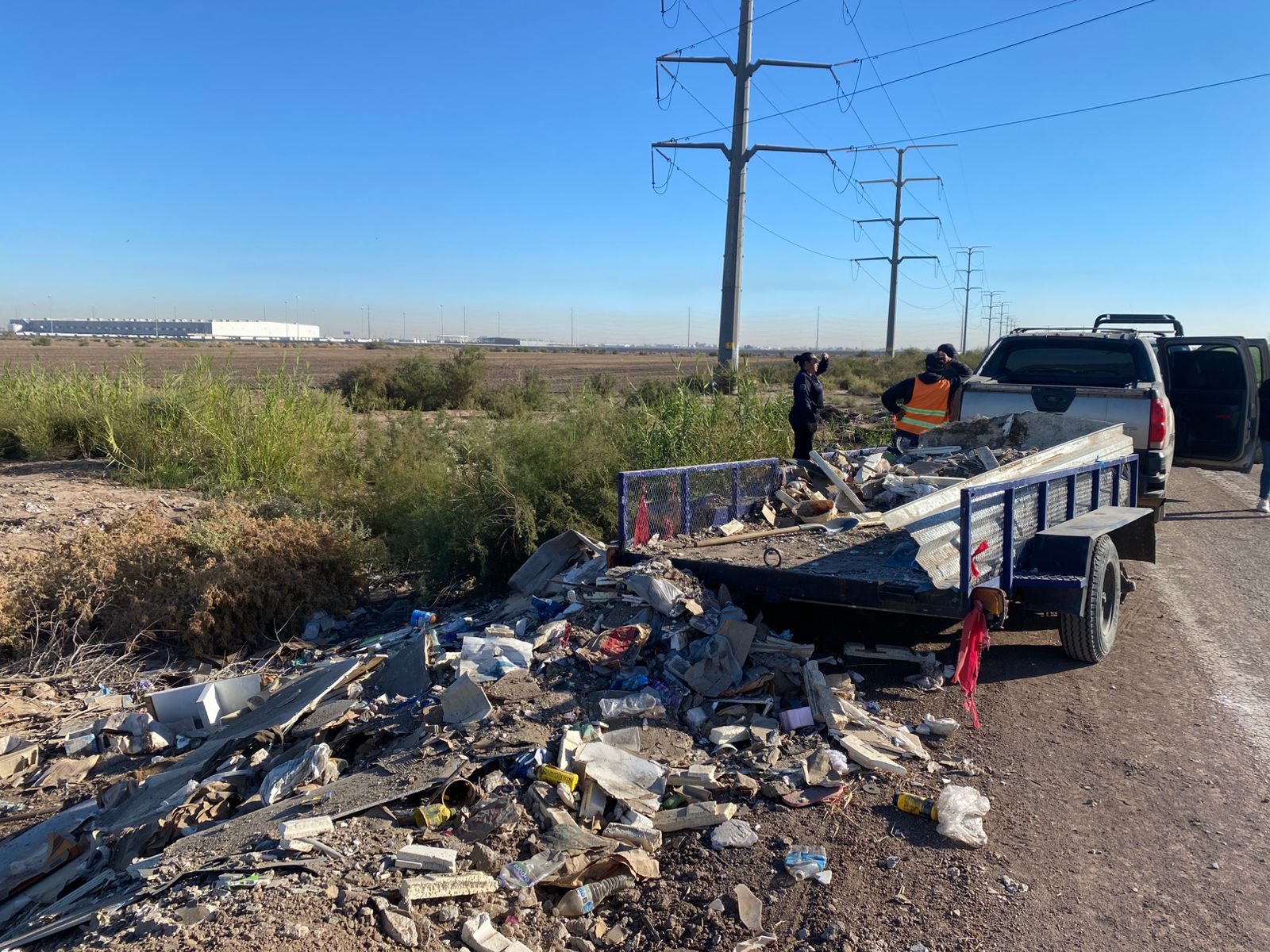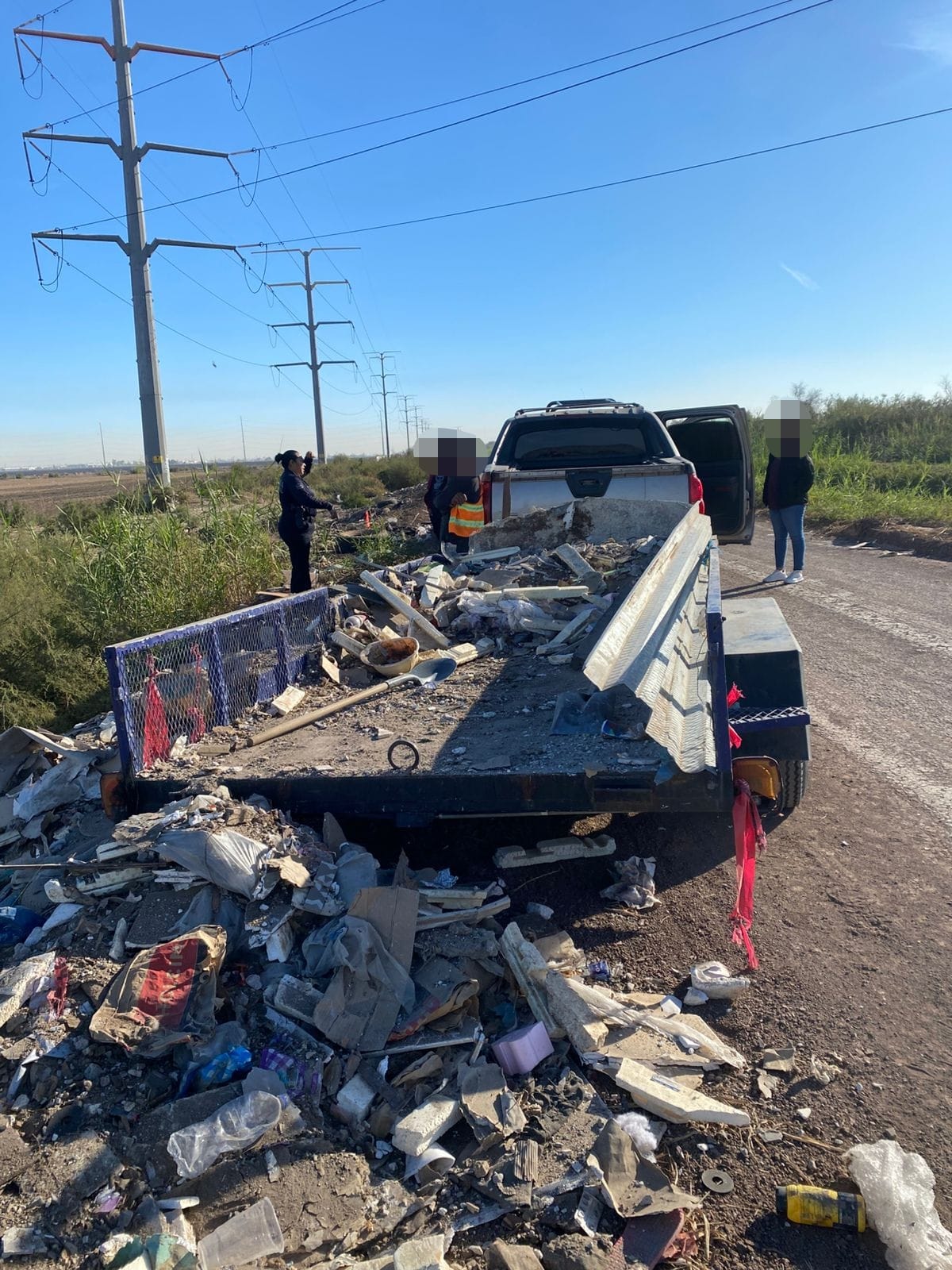 Mexicali, Baja California, a 12 de diciembre de 2025. Derivado de los constantes recorridos de vigilancia preventivos implementados con el objetivo de inhibir todo tipo de incidencia, agentes de la Dirección de Seguridad Pública Municipal de Mexicali (DSPM) detuvieron este viernes a tres personas por arrojar escombro y basura a un costado del Canal Reforma.