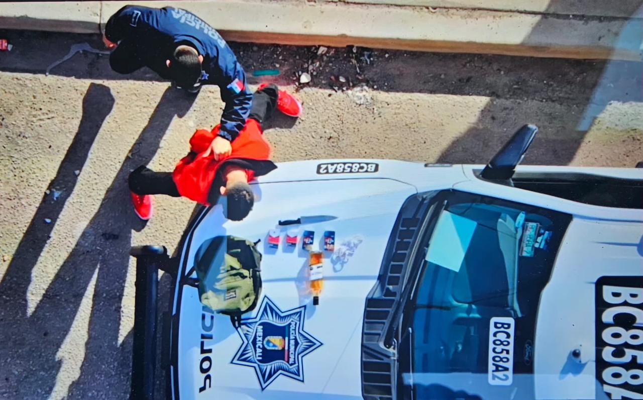 Mexicali, Baja California, a 04 de diciembre de 2025. Gracias a la utilización del dron policial operado por la Unidad Delta de la Dirección de Seguridad Pública, agentes de la Policía Municipal de Mexicali y la Agencia Estatal de Investigación (AEI) detuvieron este jueves de manera coordinada a un presunto objetivo prioritario relacionado a múltiples robos con violencia cometidos a distintas sucursales de la cadena comercial Oxxo en los últimos meses.