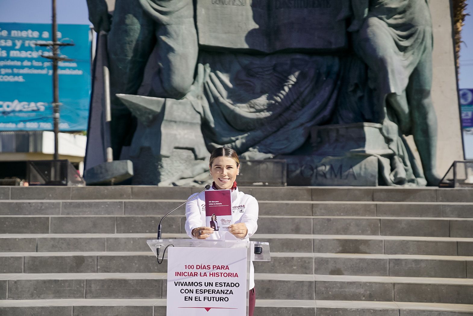 Frente al monumento a Benito Juárez en Mexicali, la candidata a la gubernatura de la coalición “Juntos Haremos Historia en Baja California”, Marina del Pilar Avila Olmeda, presentó este jueves 27 de mayo una serie de propuestas a desarrollar durante sus primeros 100 días como gobernadora del estado, si la voluntad popular materializa el triunfo de la Cuarta Transformación expresado en todas las encuestas.