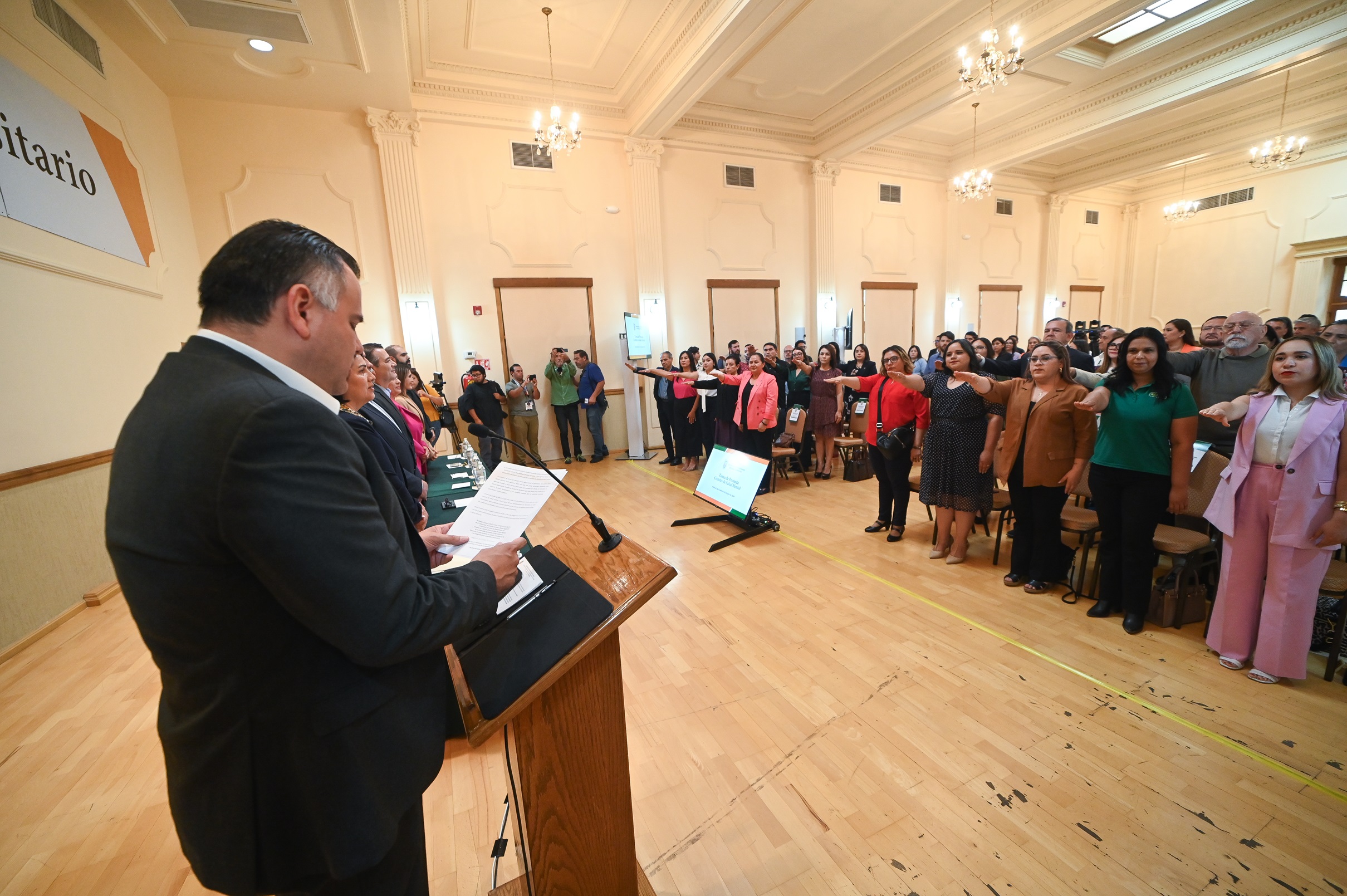 Mexicali, Baja California, viernes 21 de junio de 2024.- A través de los Comités de Salud Mental (COSAME), la Universidad Autónoma de Baja California (UABC) busca impulsar las políticas institucionales de prevención y atención a la comunidad universitaria en aspectos de salud mental y la promoción del bienestar emocional en favor del desarrollo integral de las universitarias y los universitarios, por lo que el día de hoy el rector de la UABC, doctor Luis Enrique Palafox Maestre tomó protesta a las personas que integrarán los COSAME en cada campus.
