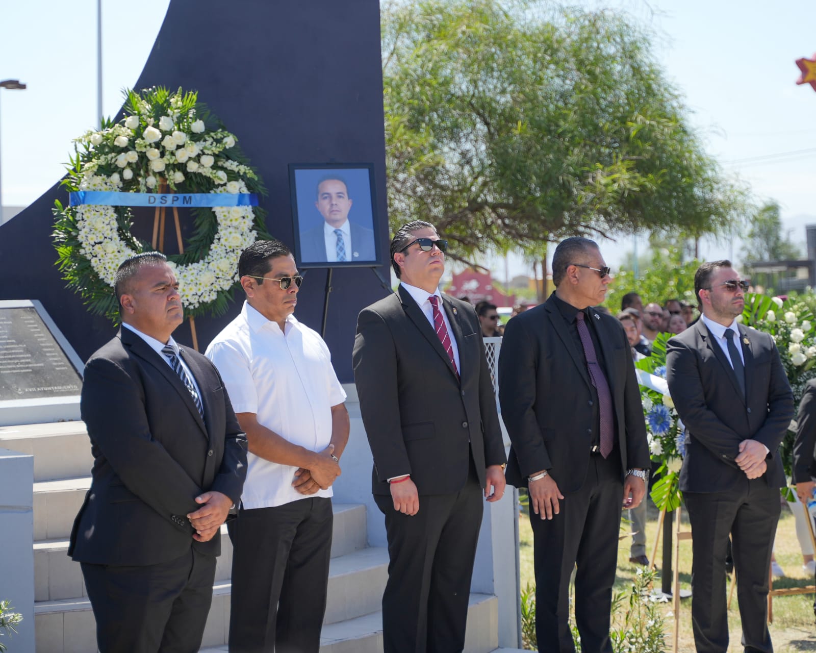 En representación de la Presidenta Municipal de Mexicali, Norma Alicia Bustamante Martínez, el Secretario del 24 Ayuntamiento Daniel Humberto Valenzuela, junto al Director de Policía Municipal, Pedro Ariel Mendívil, encabezaron la ofrenda floral colocada en el monumento al Oficial Caído en la Comandancia Central de la corporación de seguridad.