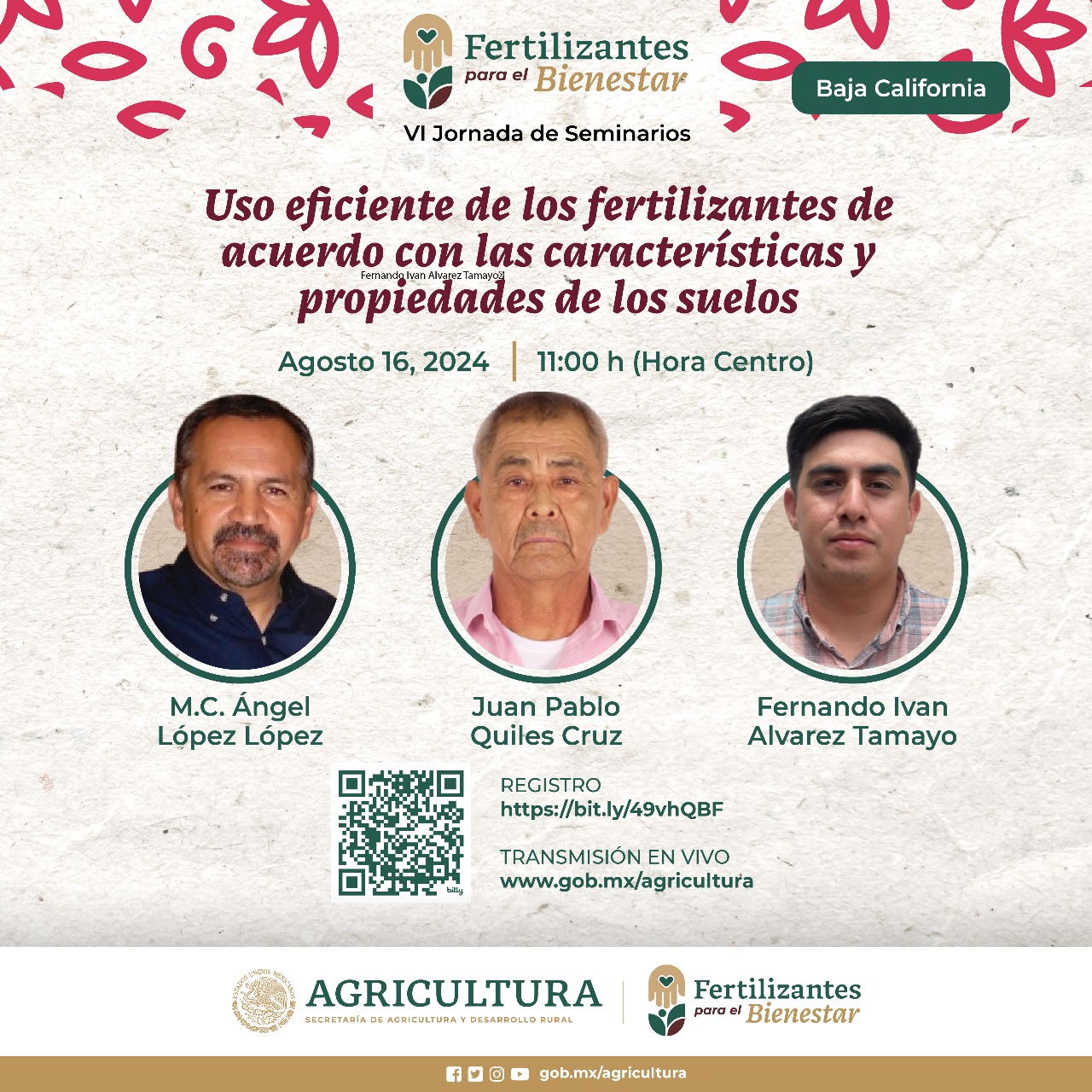 En el marco del arranque de la sexta Jornada de Seminarios y Conversatorios del Programa de Fertilizantes para el Bienestar, la Representación Estatal de la Secretaría de Agricultura y Desarrollo Rural en Baja California, realizará el próximo viernes, 16 de agosto del 2024, el segundo Seminario, con el tema “Uso eficiente de los fertilizantes de acuerdo con las características y propiedades de los suelos”.