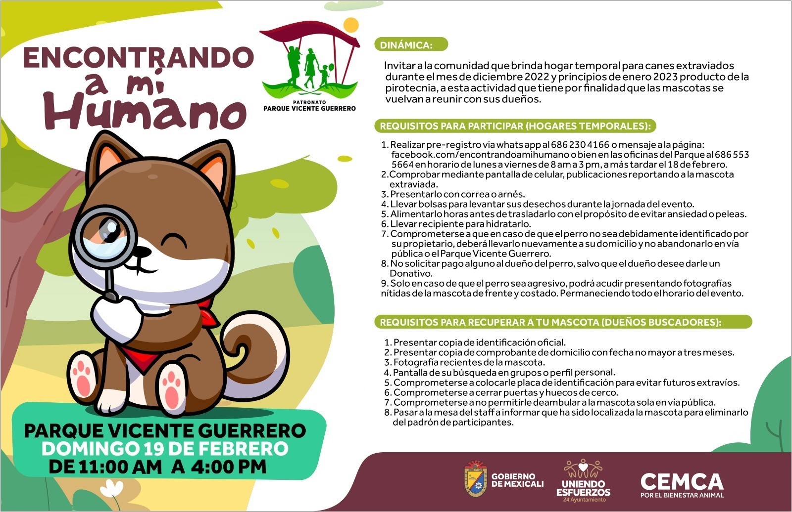 Mexicali, B.C. a 17 de febrero de 2023.- El próximo domingo 19 de febrero a partir de las 11:00 a.m. se llevará a cabo la actividad “Encontrando a mi humano”, la cual tiene el propósito de ayudar a reunirá familias con las mascotas que se hayan extraviado por huir de sus hogares ante la pirotectnia utilizada en temporada decembrina e inicio de año.