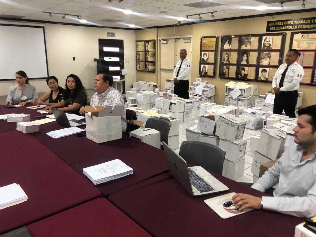 La fase de recepción de las urnas ha concluido en su totalidad, por lo que la Diputada Cano anunció que se han conformando 6 mesas de conteo de votos, con 4 integrantes por mesa, un abogado que de fe al resultado, un secretario y dos escrutadores, estando presente un notario público.