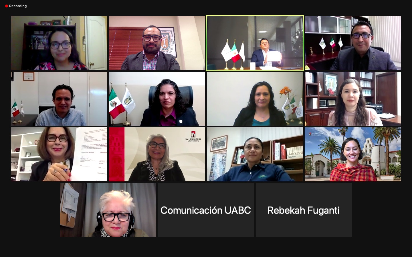 Para oficializar este acuerdo, se realizó una ceremonia virtual que fue presidida por el rector de la UABC y la presidenta de la SDSU, los doctores Daniel Octavio Valdez Delgadillo y Adela de la Torre, respectivamente, quienes fueron los encargados de signar el documento que selló la colaboración entre estas universidades.
