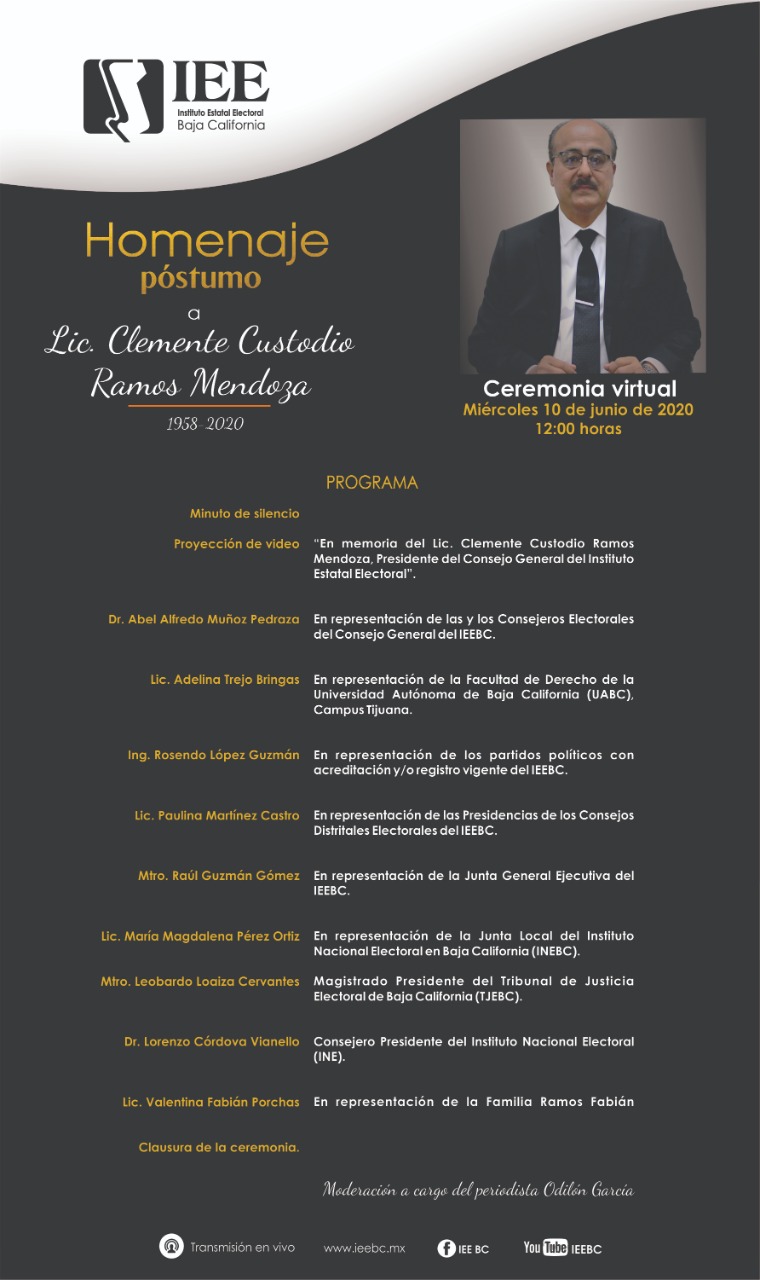 El Consejo General del Instituto Estatal Electoral de Baja California (IEEBC), realizará un homenaje póstumo en memoria de Clemente Custodio Ramos Mendoza, quien fuera Consejero Presidente durante el periodo comprendido de octubre de 2017 a mayo de 2020.
