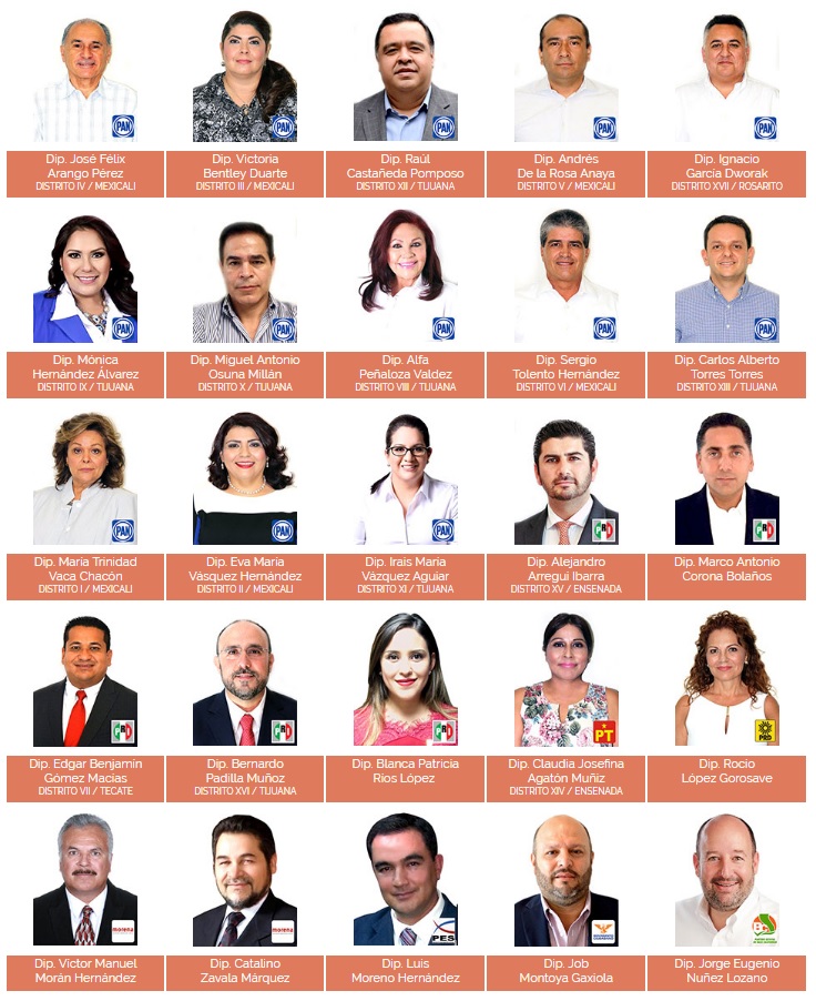 Asimismo, por los legisladores del PRI: Alejandro Arregui Ibarra, Bernardo Padilla Muñoz, Marco Antonio Corona Bolaños Cacho y Edgar Benjamín Gómez Macías; así como por los diputados Víctor Manuel Moran Hernández y  Catalino Zavala Márquez, de Morena: Rocío López Gorosave, del PRD; Luis Moreno Hernández, del PES; Jorge Eugenio Núñez Lozano, del PBC; Job Montoya Gaxiola, de MC y Claudia Josefina Agatón Muñiz, del PT.
