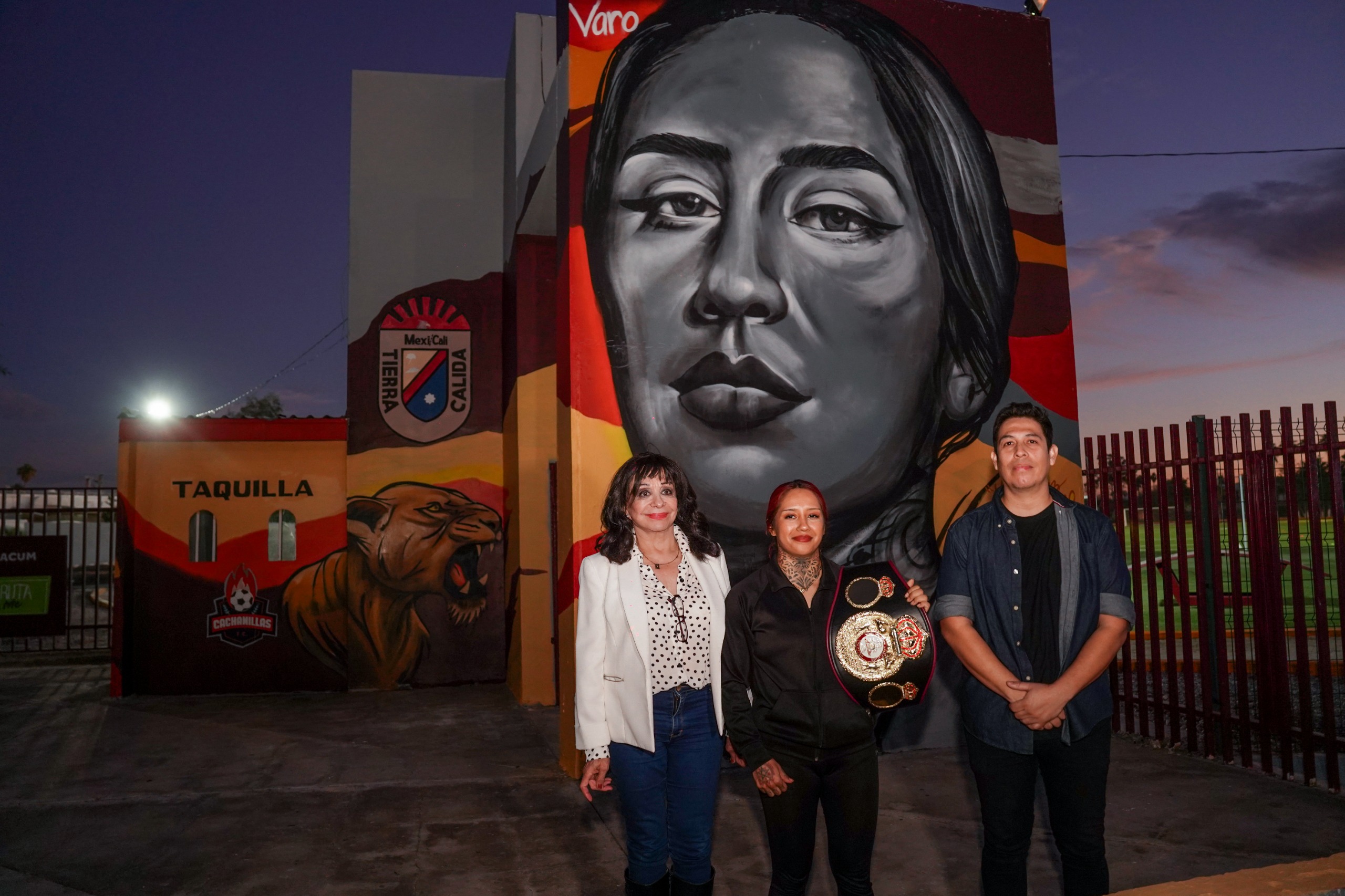 Mexicali, B.C. A 28 de noviembre 2025.- Continuando con la iniciativa “Ruta del Arte” para transformar los espacios públicos, la presidenta municipal Norma Bustamante encabezó un recorrido por los nuevos murales ubicados en el exterior del Campo Necaxa, los cuales rinden homenaje a las mujeres mexicalenses dedicadas al deporte.