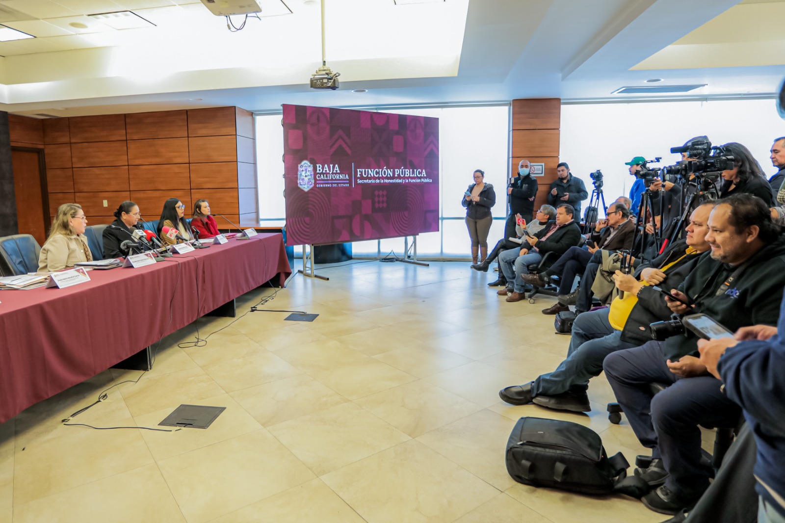 En conferencia de prensa en la ciudad de Mexicali, la funcionaria estatal informó que una denuncia se integra por deficiencias en el ejercicio del recurso federal para el mantenimiento de escuelas bajacalifornianas por 64 millones de pesos, por lo que se están previendo delitos de ejercicio ilícito del servicio público, uso ilícito de atribuciones y peculado, presuntamente cometidos por 11 personas servidoras públicas y un particular.