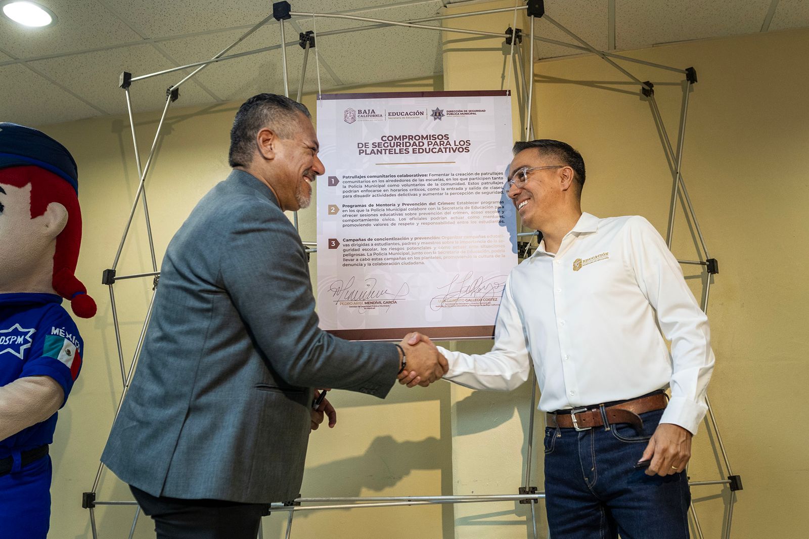 MEXICALI.- Los titulares de la Secretaría de Educación de Baja California y de la Dirección de Seguridad Pública Municipal de Mexicali, Luis Gilberto Gallego Cortez y Pedro Ariel Mendívil García, respectivamente, firmaron un acuerdo de colaboración para cuidar las escuelas de Mexicali, en el marco de la estrategia de Seguridad que se trabaja con la finalidad de consolidar el programa “Vigilando nuestra escuela”, en este municipio y su Valle