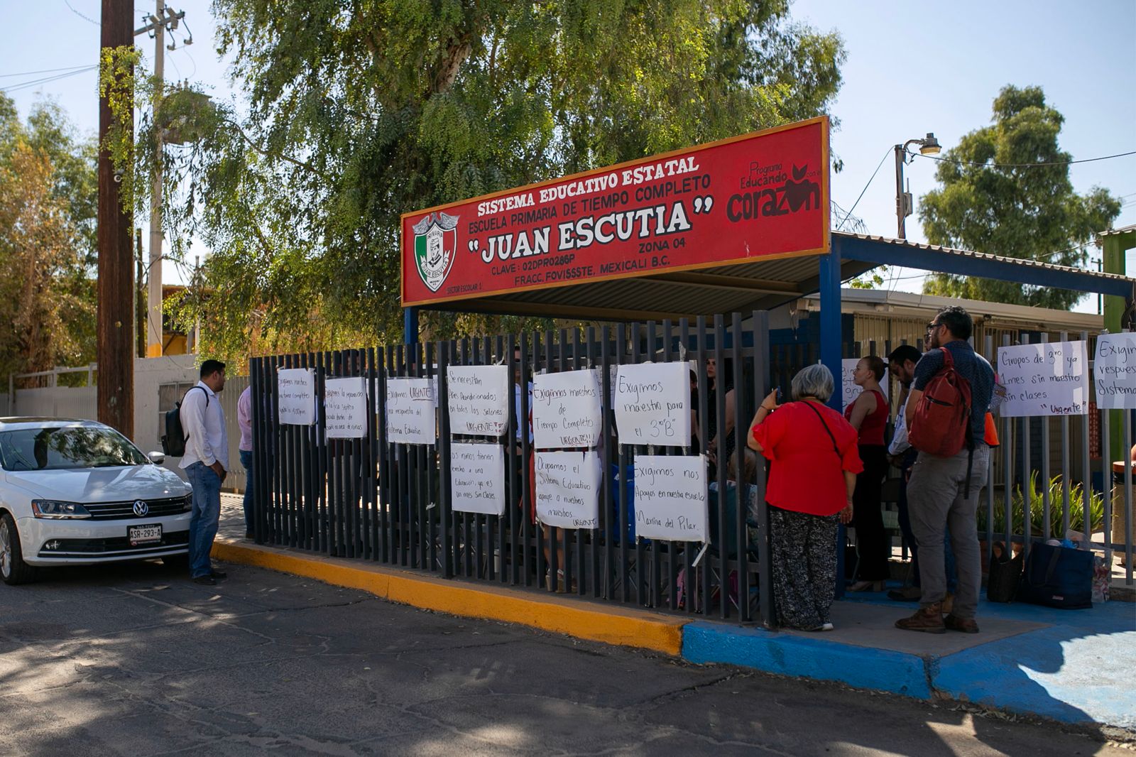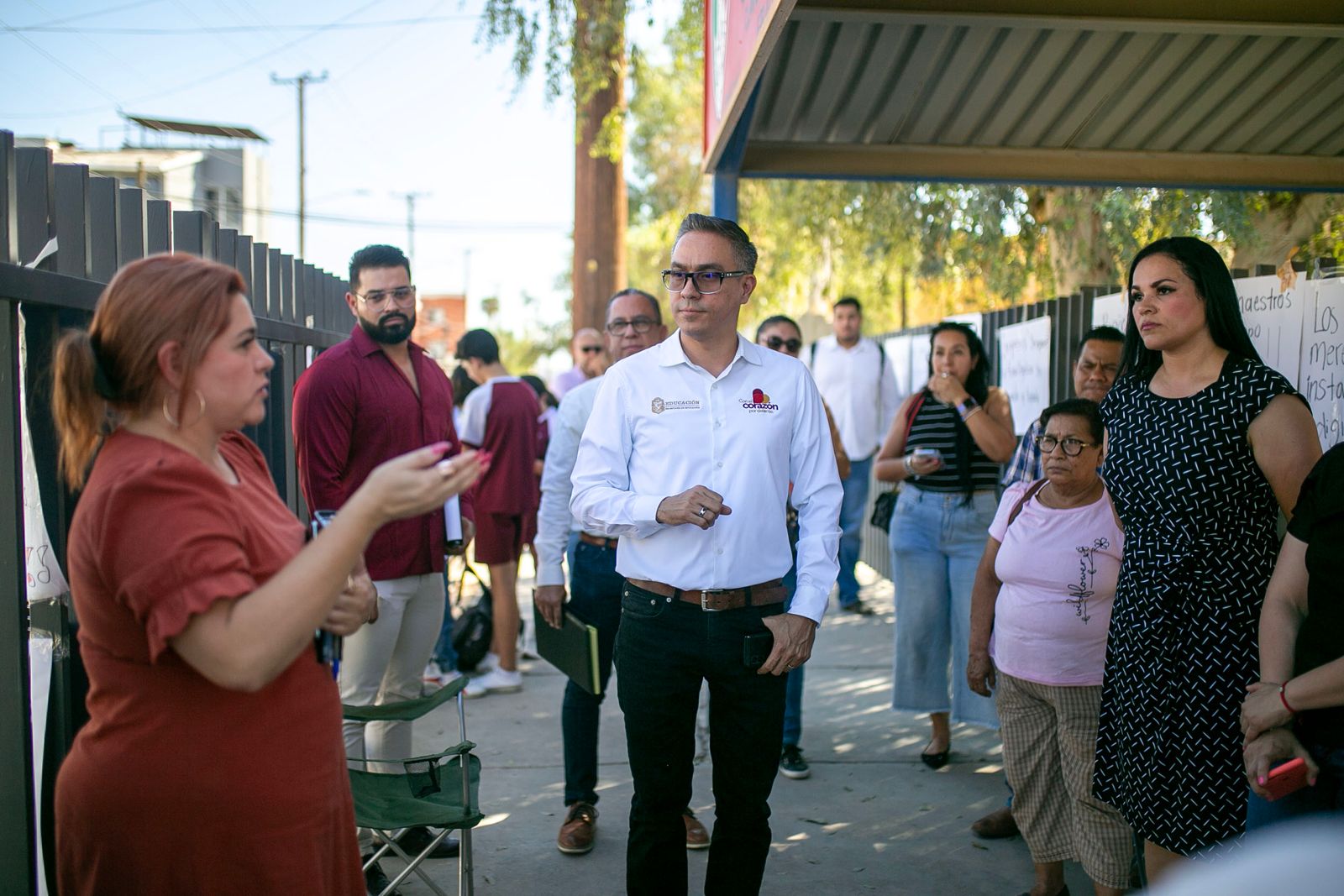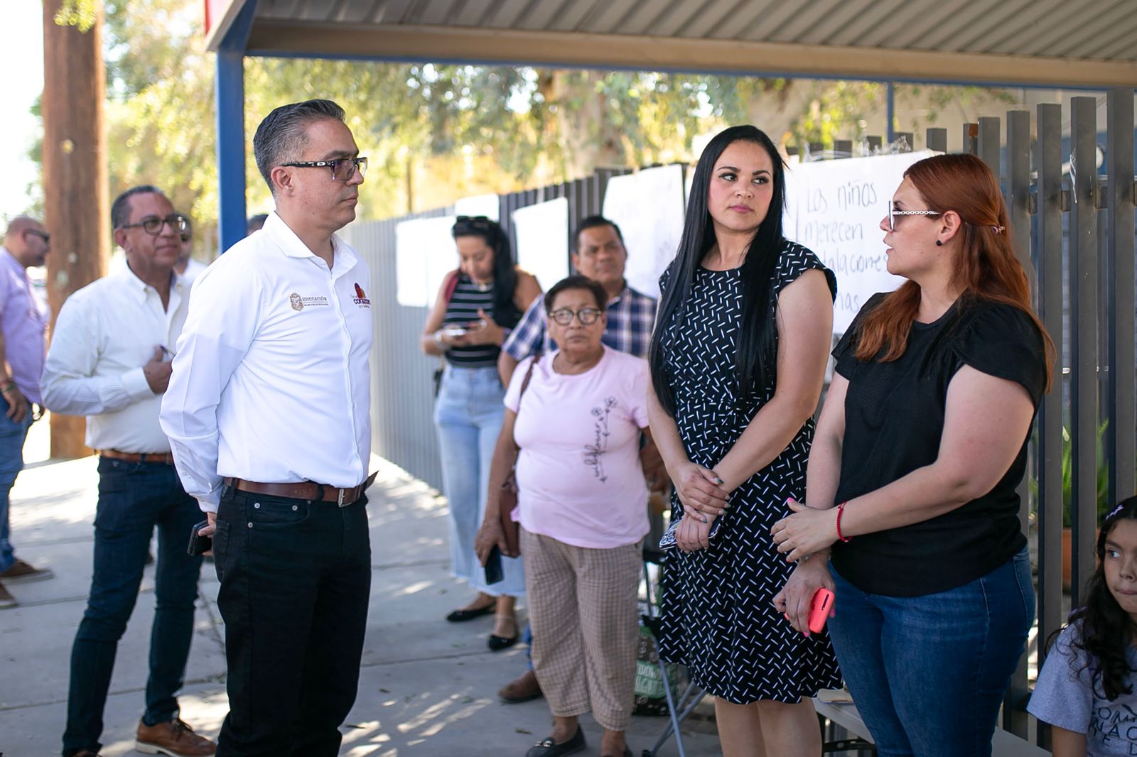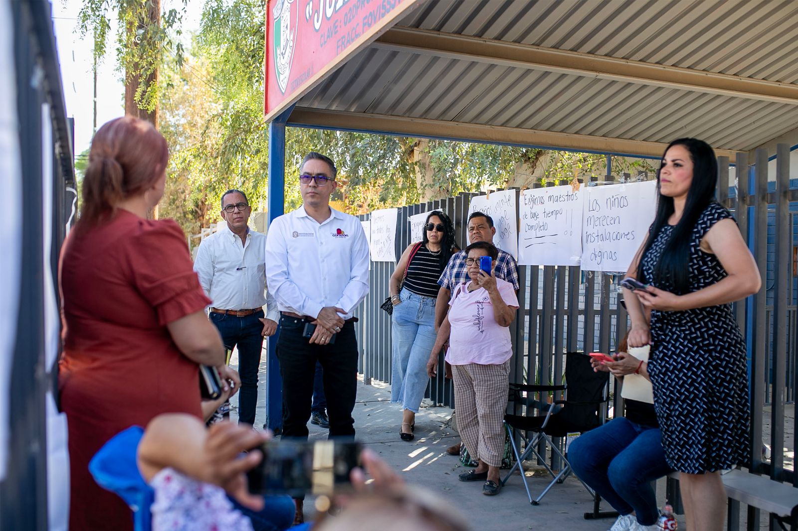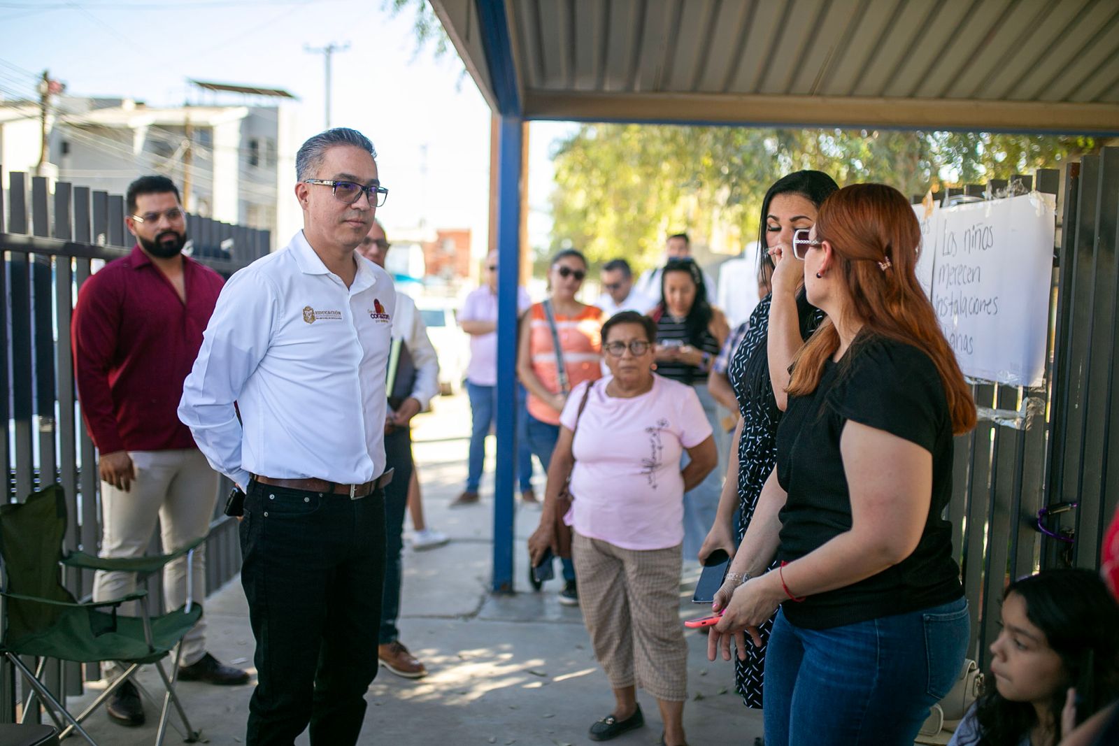 MEXICALI.- El Secretario de Educación de Baja California, Luis Gilberto Gallego Cortez, acompañado de la subsecretaria de Planeación de Planeación y Administración, Susana Marisol Tapia Sierra, y el director del Sistema para la Carrera de las Maestras y los Maestros (DISICAMM), Adrián Esaú Salazar Pineda, visitó a los padres de familia en la escuela primaria “Juan Escutia” ubicada en el municipio de Mexicali, para reiterarles el compromiso de la dependencia a su cargo en la solución a las inquietudes manifestadas relacionadas con la falta de docentes y las condiciones de infraestructura del plantel.