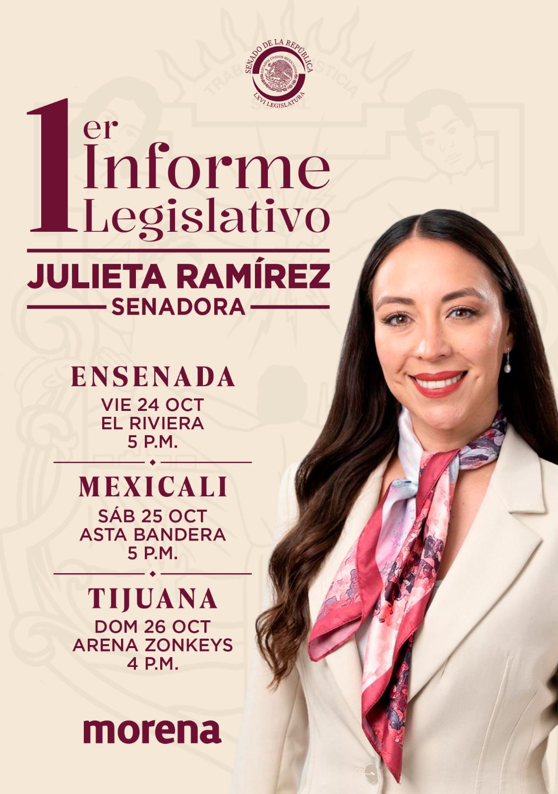 Mexicali, BC, 23 de octubre 2025.- Como un ejercicio de transparencia y rendición de cuentas, llevará a cabo su Primer Informe de Actividades la Senadora morenista Julieta Ramírez Padilla.