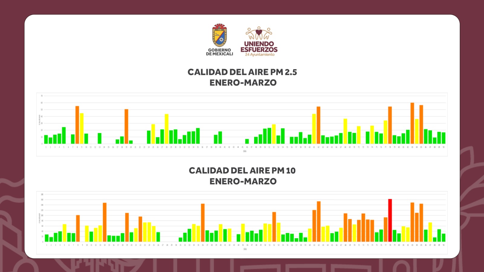 El municipio de Mexicali trabaja para mantener el resto del año estos índices, tales son los cursos para cambiar los asaderos de carbón por gas. Según la gráfica el día marcado con color rojo corresponde a un día en especial con varios incendios en la misma jornada.