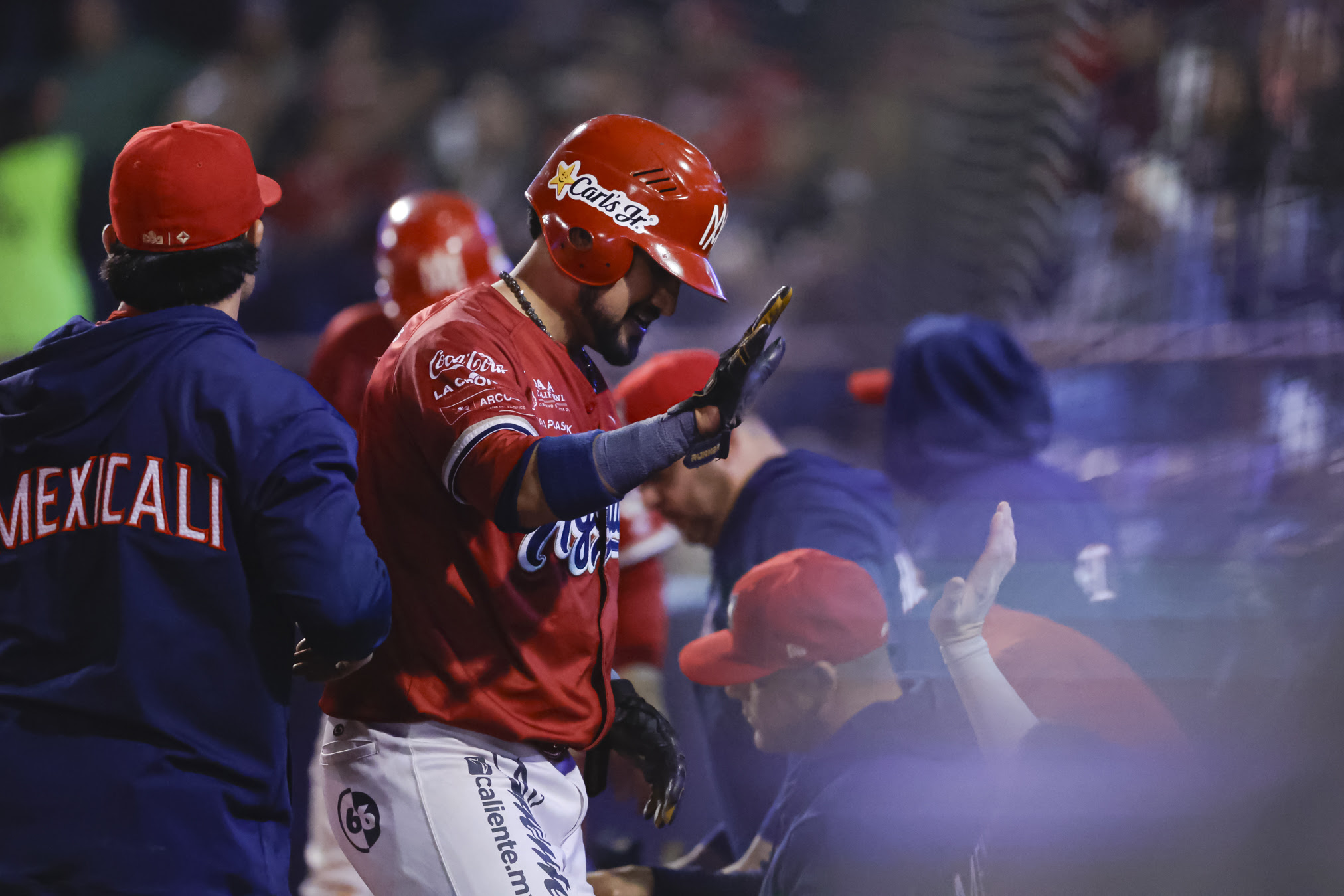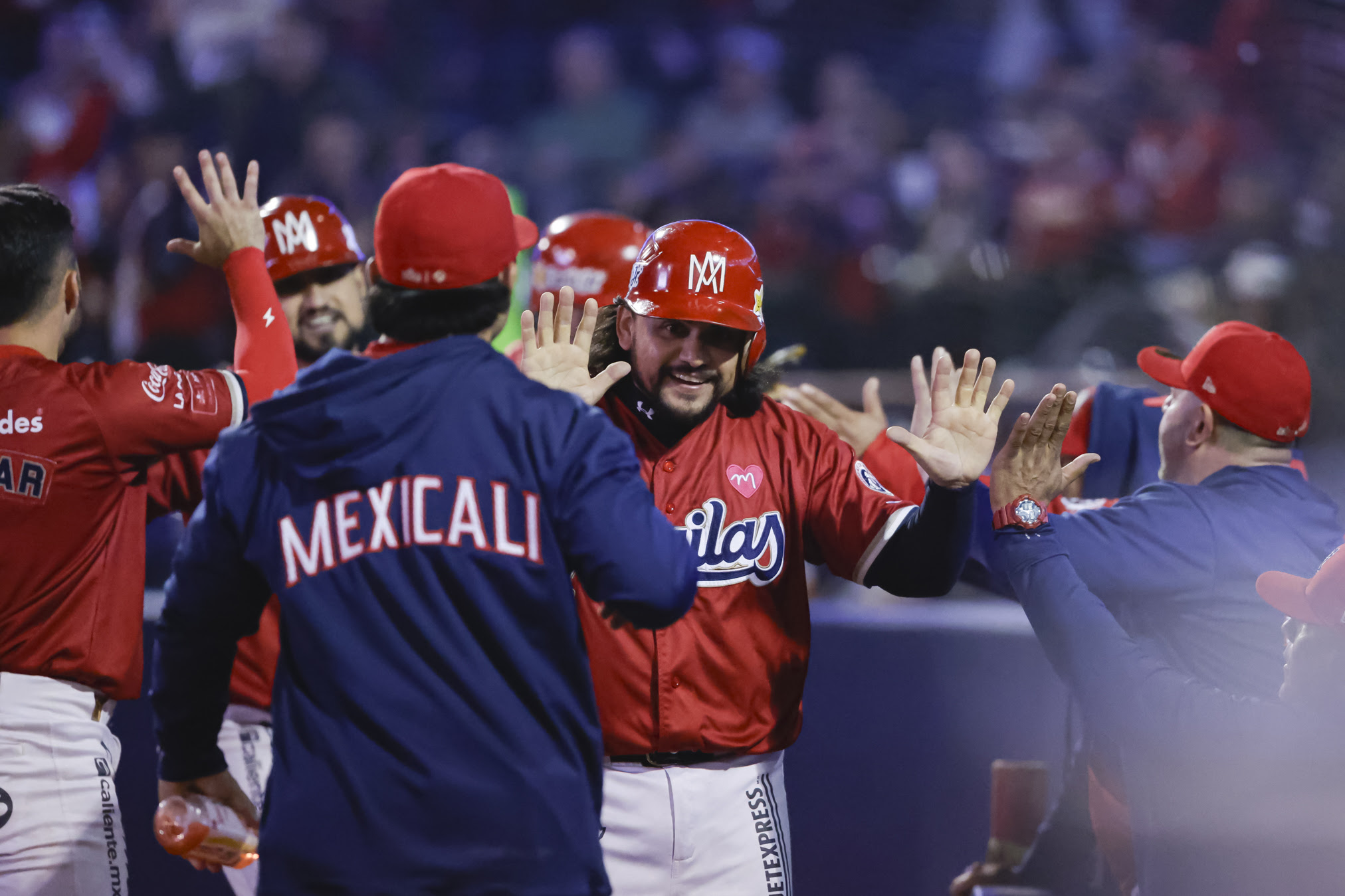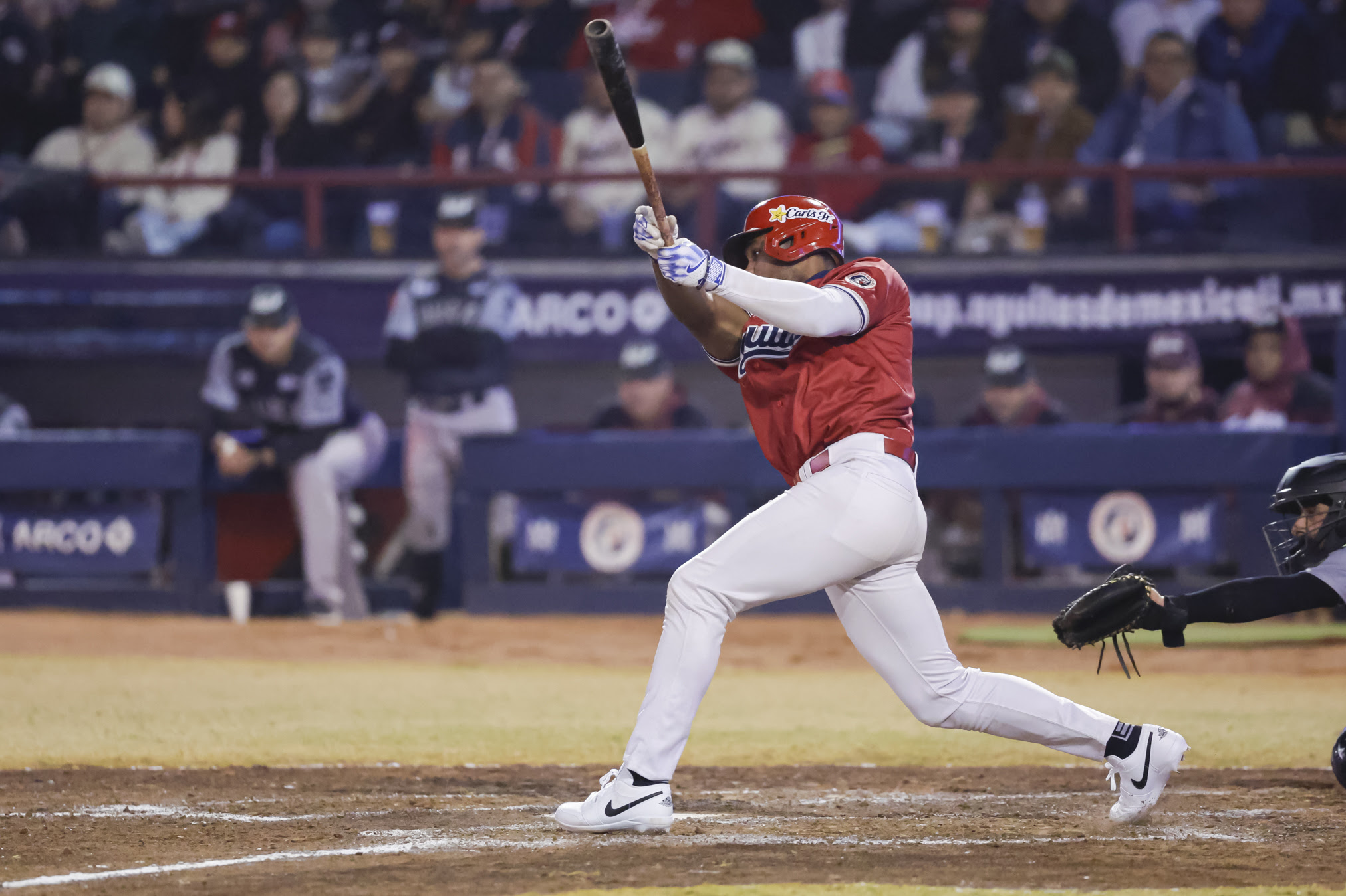 Mexicali, Baja California., 5 de noviembre de 2024. El Nido de Los Águilas. Wynton Bernard conectó triple productor de dos carreras en el cuarto capítulo, para darle la vuelta a la pizarra y el triunfo a Los Águilas con marcador de 3-2 en el primero de la serie frente a Tomateros de Culiacán en El Nido de Los Águilas.