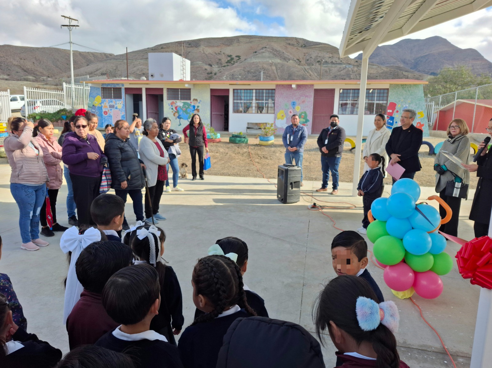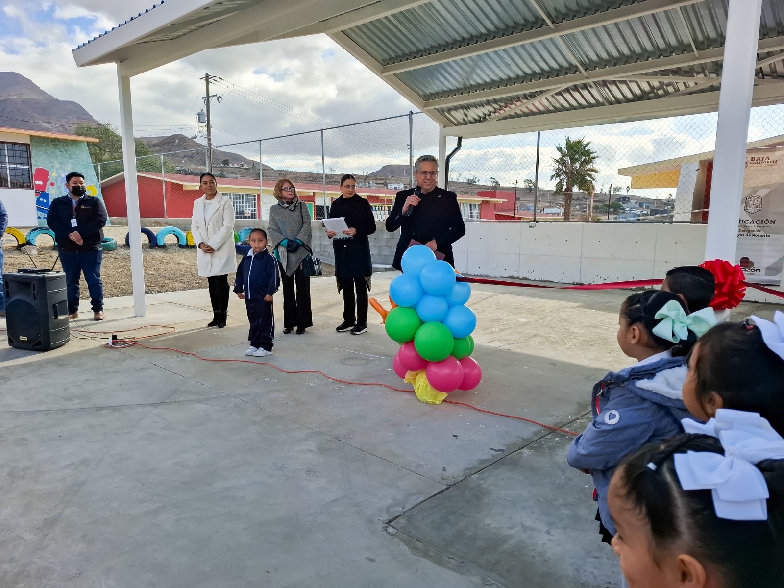 PLAYAS DE ROSARITO. – En el marco del Programa La Escuela es Nuestra (PLEN) el Jardín de Niños Juan Escutia de la Comunidad de Rancho 40 inauguró con alumnos, padres de familia y autoridades educativas la techumbre de su explanada que tuvo una inversión de 300 mil pesos.