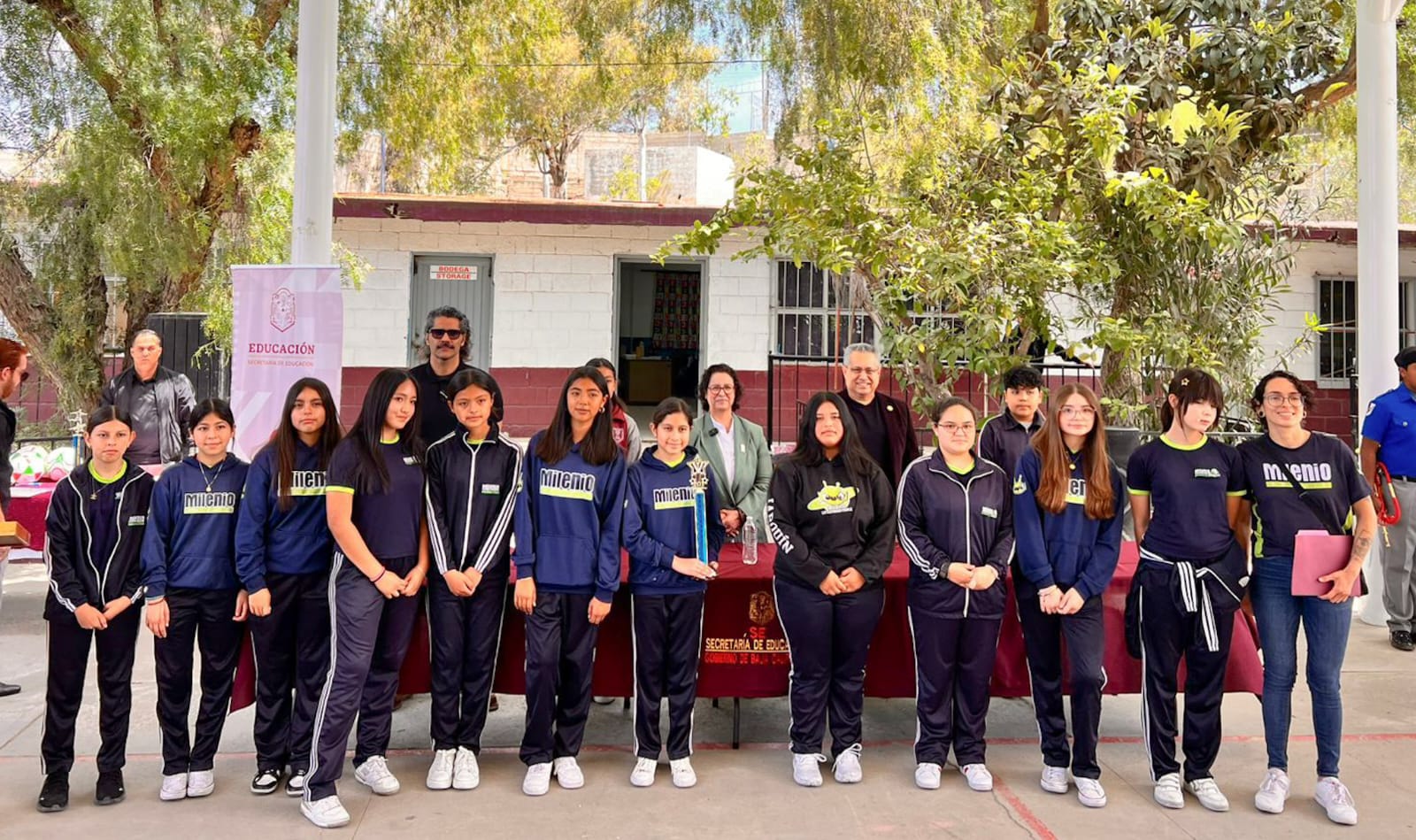 La presidenta Municipal del X Ayuntamiento, María del Rocío Adame Muñoz, y el delegado de Educación, Juan Carlos Huerta Ávila, presidieron la ceremonia quienes reconocieron el esfuerzo y compromiso al participar en las disciplinas de basquetbol, fútbol, voleibol, balonmano, atletismo y ajedrez.