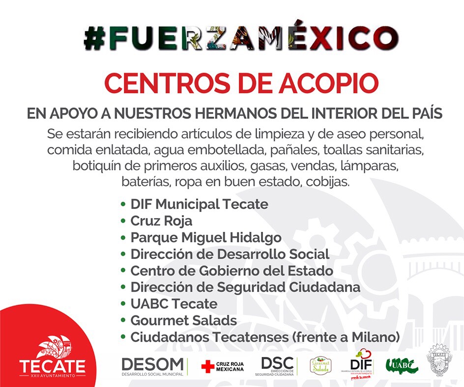 El Gobierno Municipal convoca a los ciudadanos tecatenses a unirse en un acto de solidaridad, apoyo y respaldo a los afectados tras el sismo de 7.1 grados de magnitud que sucumbió a nuestros hermanos de la Ciudad de México, Estado de México, Puebla, Veracruz y Guerrero, para facilitar estas acciones, para tal efecto se informa a la comunidad donde se encuentran los centros de acopio en la ciudad: