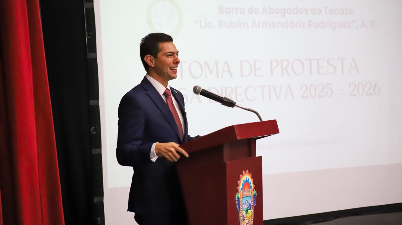 Tecate, Baja California a 29 de Noviembre de 2025.– El alcalde Román Cota Muñoz asistió como invitado de honor a la ceremonia de toma de protesta de la nueva Mesa Directiva de la Barra de Abogados de Tecate “Lic. Rubén Armendáriz Rodríguez”, realizada en el Teatro de la Ciudad, donde reconoció la labor del gremio jurídico en la construcción de un municipio más justo y con mayor acceso a la legalidad.