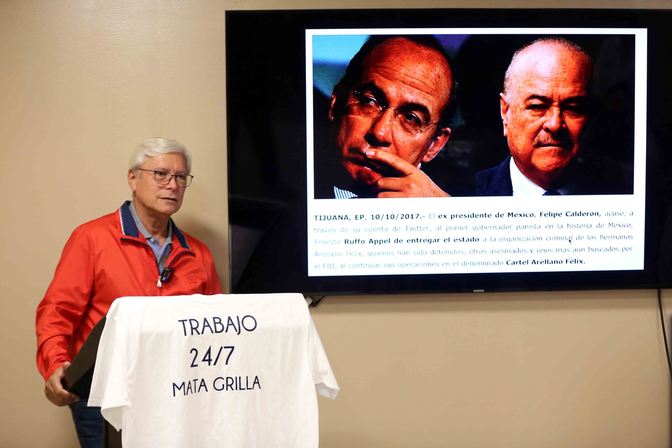 Compartió entonces, en un monitor de televisor, una serie de publicaciones de diversos medios de comunicación a niveles regional y nacional, que salieron en circulación durante y después de la administración de Ruffo Appel, las cuales vinculan a él y a su hermano Claudio Ruffo, con el cartel de los Arellano Félix; así como acusaciones que hizo el ex presidente Felipe Calderón Hinojosa, en el año del 2017.