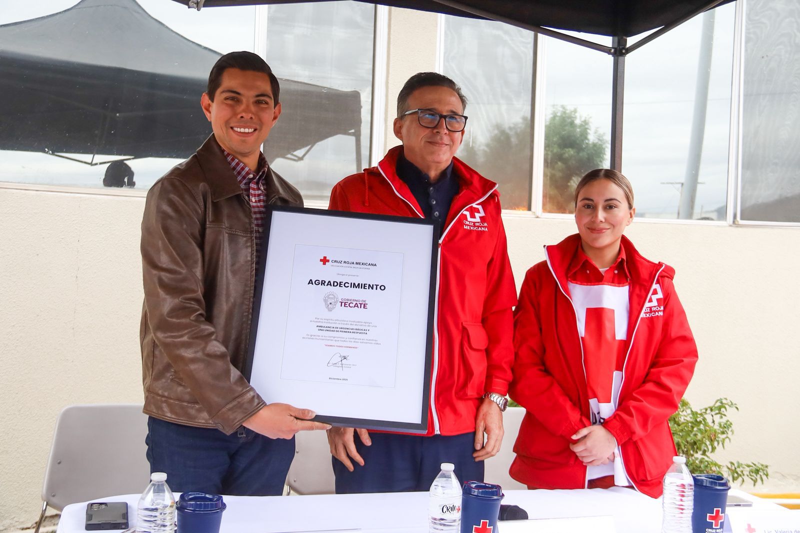 Tecate, Baja California a 23 de diciembre de 2025.– Como parte del compromiso del Gobierno de Tecate con la seguridad, la prevención y el bienestar de las familias, el alcalde Román Cota Muñoz entregó dos unidades a la Cruz Roja Mexicana, delegación Tecate, siendo una ambulancia de urgencias básicas y una unidad de primera respuesta, que permitirán fortalecer la atención oportuna ante emergencias en el municipio.