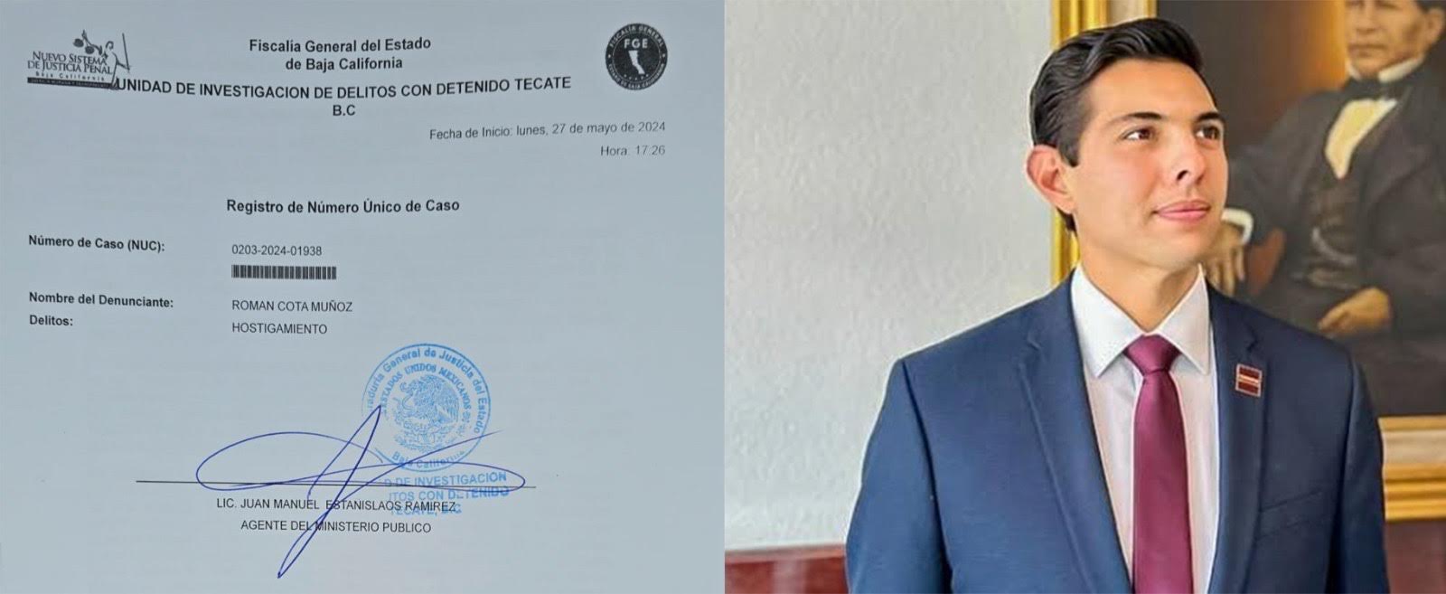 Tecate, a 27 de mayo de 2024.- Román Cota Muñoz, candidato de la coalición Sigamos Haciendo en Baja California (MORENA, Partido Verde y Fuerza por México) a la Presidencia Municipal de Tecate, presentó una denuncia por Hostigamiento, amenazas, intimidación, difamación, calumnias y lo que resulte ante la Fiscalía General del Estado (FGE) contra el alcalde Darío Benítez, por amenazas y difamación.