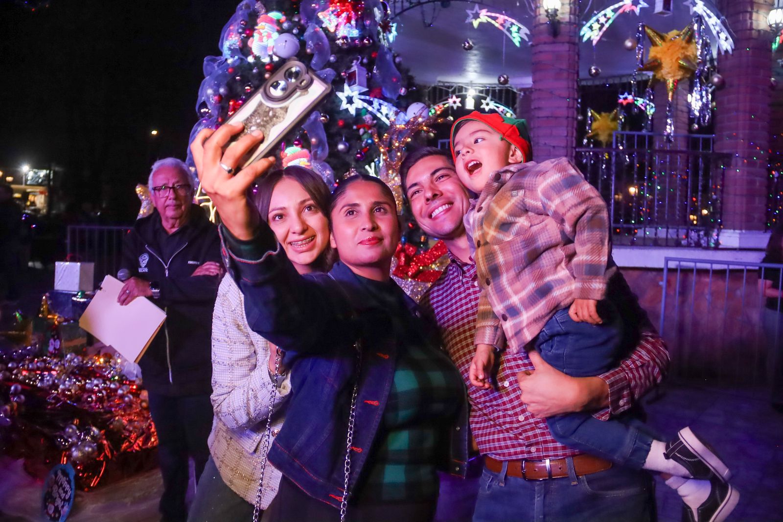El alcalde Román Cota Muñoz, acompañado de su esposa Alejandra Herrera Soto, presidenta del DIF Tecate, y su pequeño hijo Leonel, encabezó el momento más esperado de la noche: el encendido de las luces del gran pino navideño, símbolo de unión, esperanza y bienestar para las familias del Pueblo Mágico.