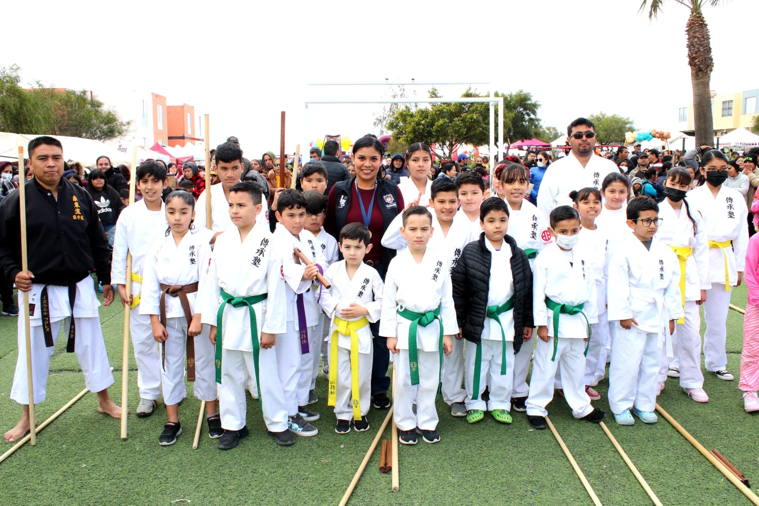 Durante la jornada de Bienestar organizada por el secretario Gerardo López Montes, alumnos de karate del centro comunitario Delicias, acompañados del instructor Israel Flores Castillo,