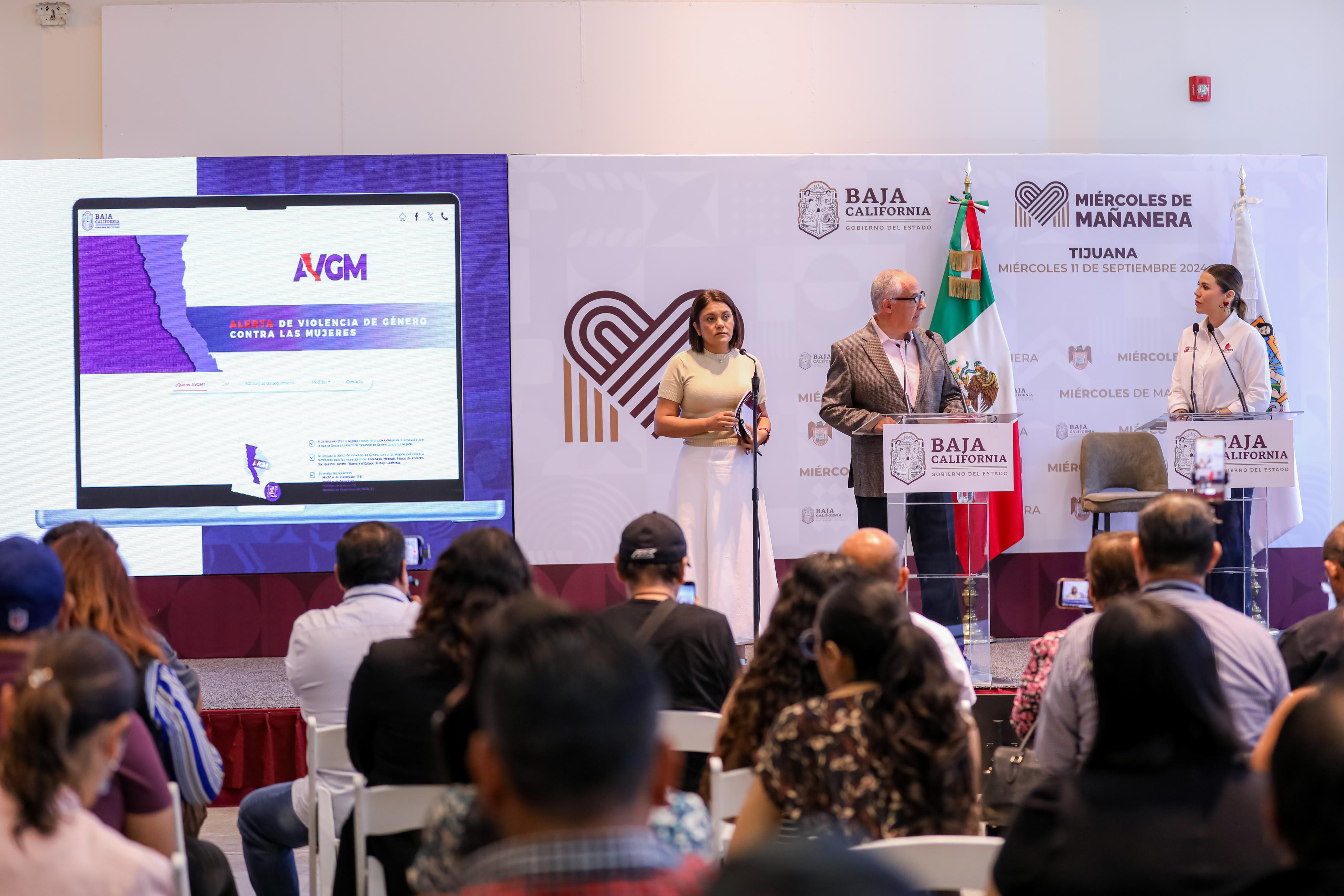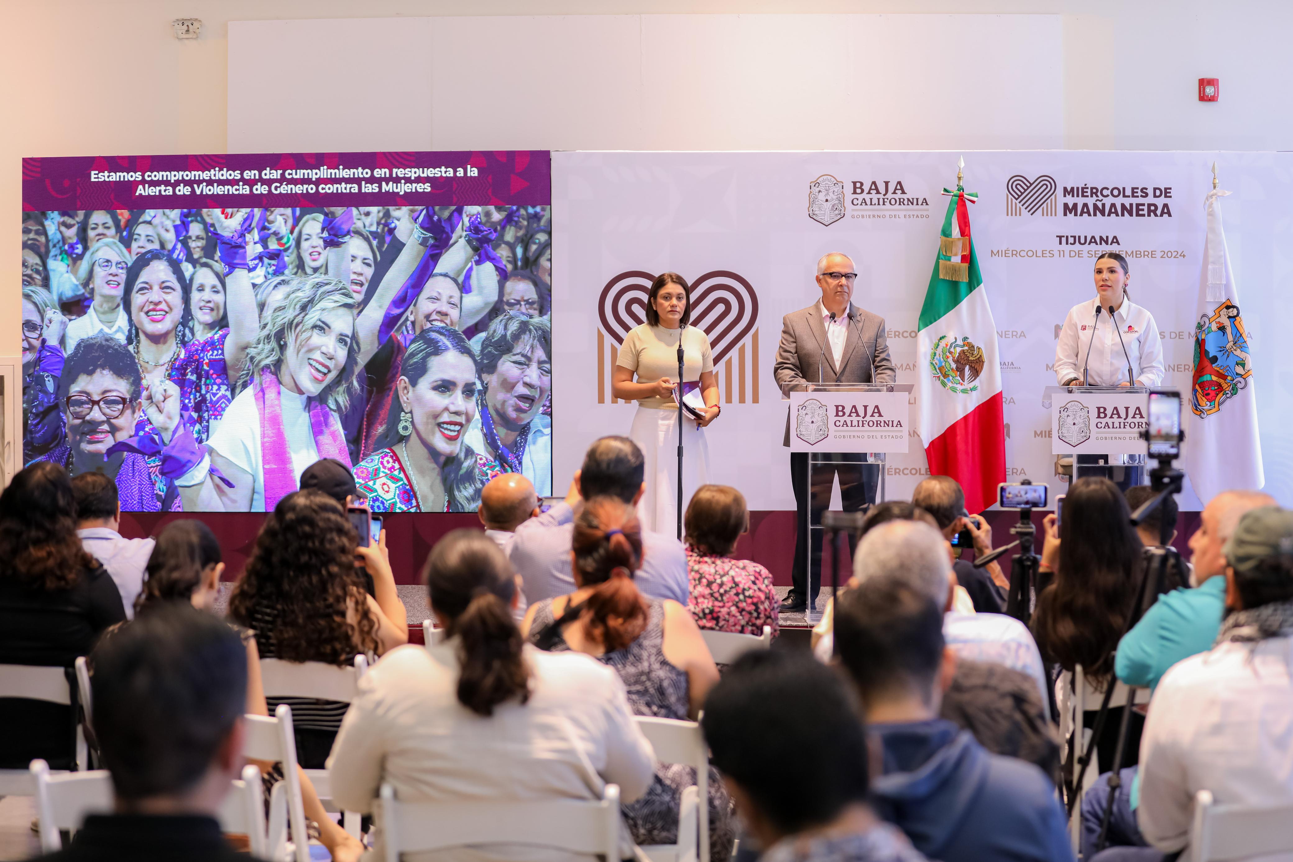 Marina del Pilar enfatizó durante el Miércoles de Mañanera que, desde el primer día de su gestión como gobernadora, se iniciaron trabajos para atender la alerta, en los que destaca la construcción de un Centro de Justicia para las Mujeres (CEJUM) en Tijuana, que brinda orientación y apoyo integral a las víctimas. Además, se construyó otro en San Quintín, y se colocó la primera piedra del Centro en Mexicali.