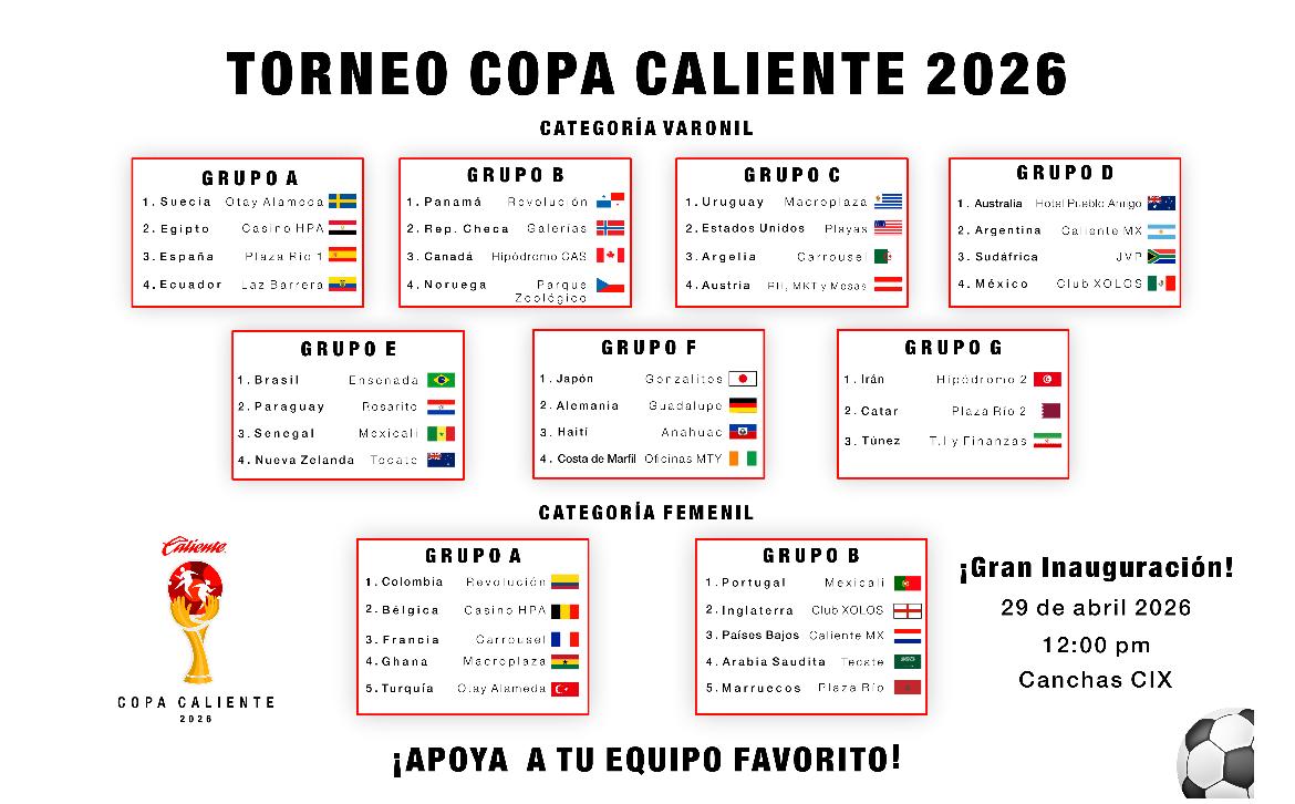 La Copa Caliente 2026 contará con categorías varonil y femenil con un total de 518 participantes en 27 equipos (hombres) y 10 integrados por mujeres; tendrá una duración de 4 semanas bajo un formato de grupos conformados por 4 equipos. Los encuentros se disputarán martes y jueves en horario de 12:00 a 15:00 hr. con juegos de 20 minutos de duración en las canchas del CIX.