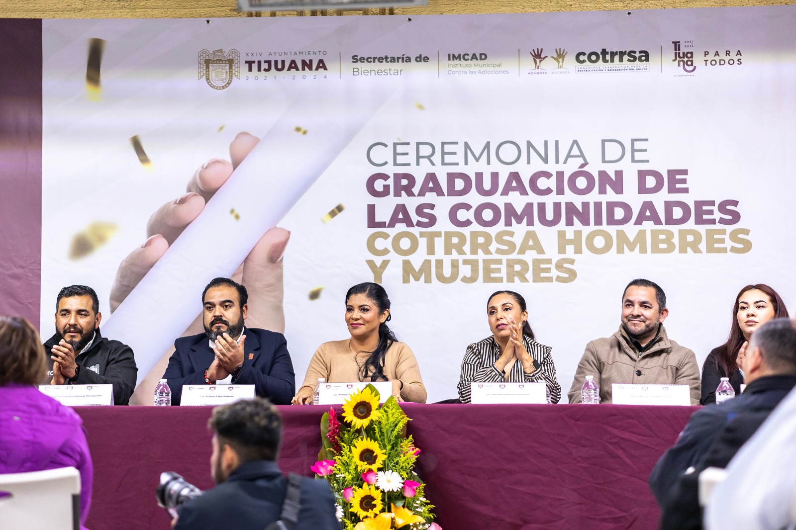 Tijuana, Baja California, 01 de marzo de 2023.- Con el propósito de reconocer el esfuerzo de 38 hombres y 12 mujeres que concluyeron exitosamente su tratamiento al presentar trastorno por consumo de sustancia psicoactivas, el XXIV Ayuntamiento encabezado por la alcaldesa Montserrat Caballero Ramírez, a través del Instituto Municipal Contra las Adicciones (IMCAD), celebró la ceremonia de Graduación de las Comunidades COTRRSA Hombres y Mujeres 2023, tras 9 meses de internamiento voluntario y gratuito.