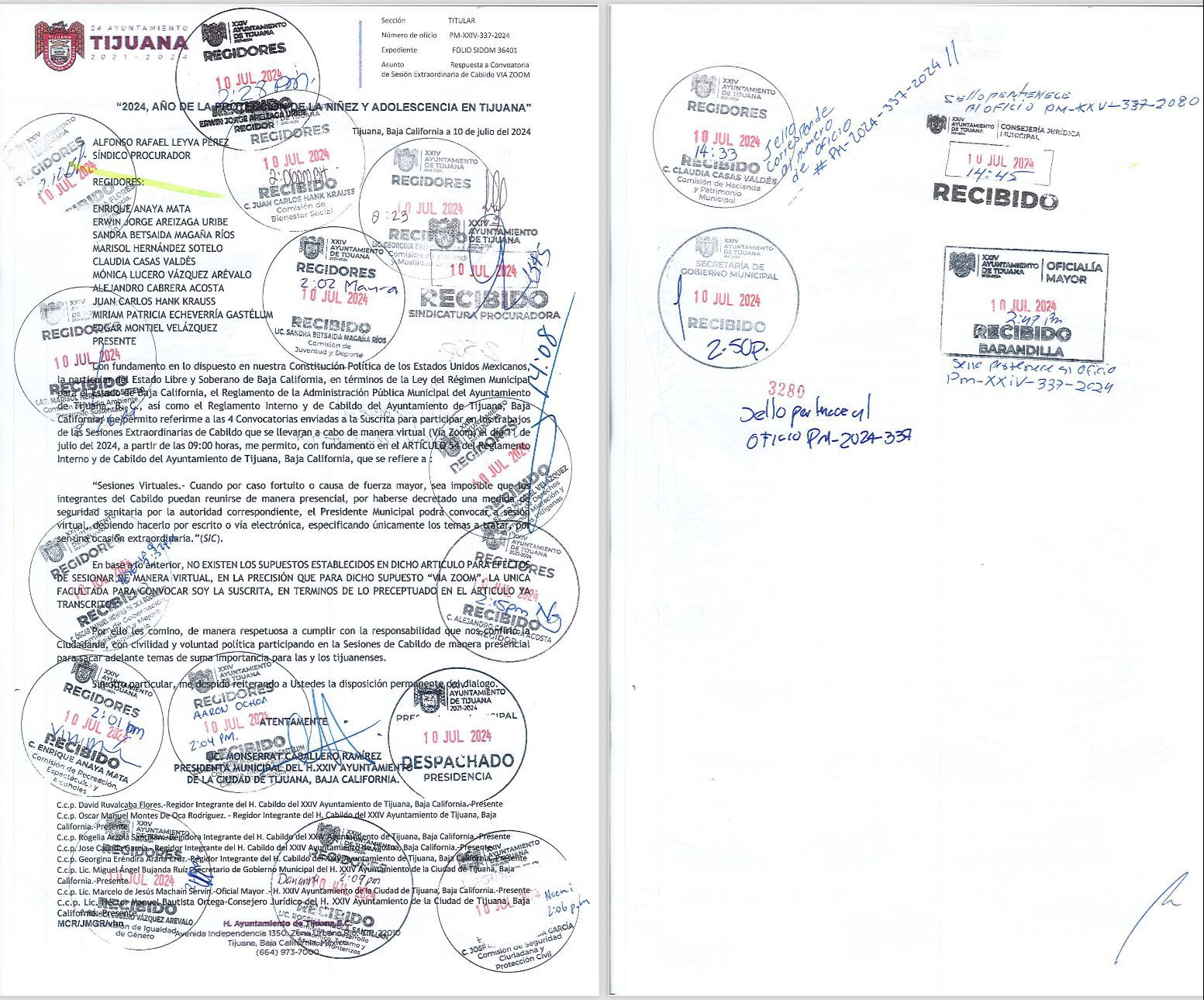 Tijuana, Baja California, a 10 de julio de 2024.-Las cuatro convocatorias a sesión de Cabildo emitidas por un grupo de regidores para el jueves 11 de julio vía Zoom, resultan contrarias a las leyes y reglamentos por los que se rige el Ayuntamiento de Tijuana, ya que no existen los supuestos legales para que se lleven a cabo de manera virtual, además de que es facultad exclusiva de la presidenta municipal convocar a sesionar bajo esta movilidad.