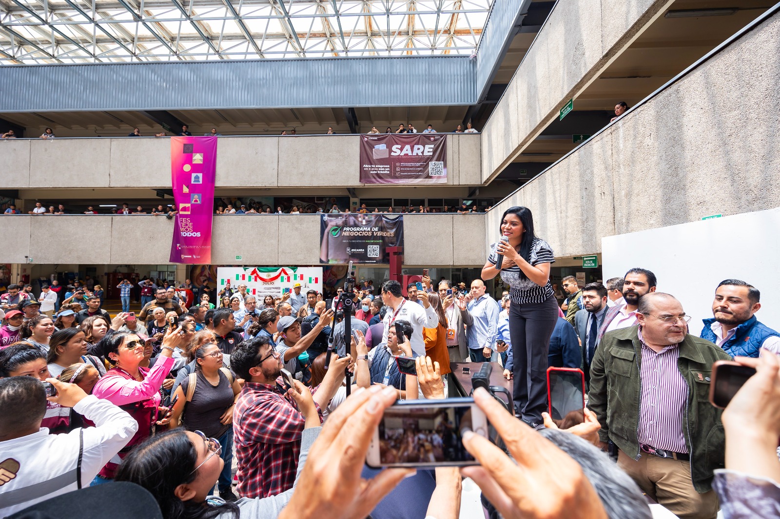 La tarde de este viernes, la primera edil acudió al patio central de Palacio Municipal para sostener una reunión de frente, tal como lo solicitó el legislador local; sin embargo, pese a que Sergio Moctezuma Martínez se encontraba en el recinto, no bajó del tercer piso para dialogar con la alcaldesa.