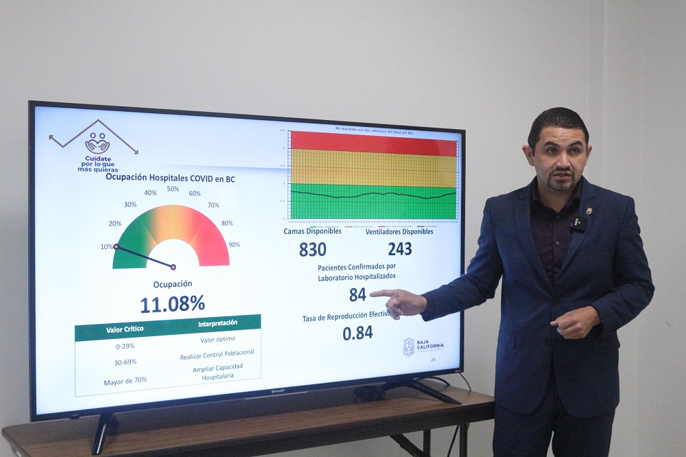 Actualmente la ocupación hospitalaria Covid en Baja California, es de 11.08%, con 830 camas disponibles, 243 ventiladores disponibles, 84 pacientes hospitalizados (confirmados por laboratorio), 43 intubados y la tasa de reproducción efectiva de 0.84.